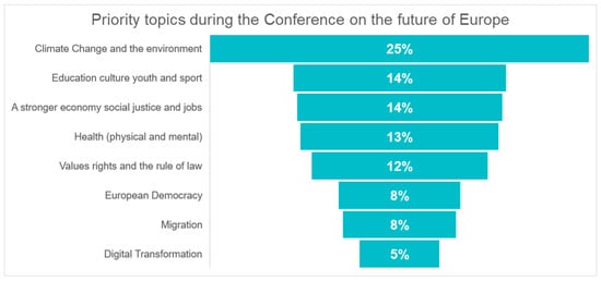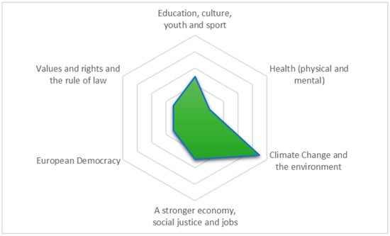 Using correspondence analysis, youth priorities were clustered into six thematic categories: (1) Democracy and Rule of Law, (2) Climate, (3) Migration, (4) Economy, Jobs, and Social Justice, (5) Digital Transformation, and (6) Education and Health. Moreover, these were aligned with identity, demographic factors, and national context. A key insight was that young people who identified primarily as “European” were more likely to support the EU and prioritize issues like democracy and digital transformation. Conversely, those with a stronger national identity expressed skepticism, particularly when focused on economic justice and migration, findings in line with broader scholarship on identity and integration [