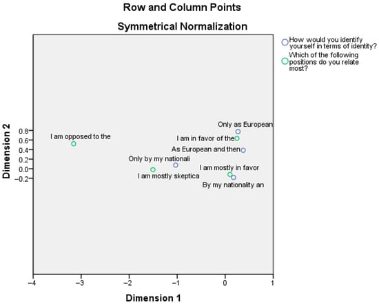 Finally, Multiple Correspondence Analysis (MCA) is applied for the variables country, stance towards the EU, and identity in order to produce a comparative map [