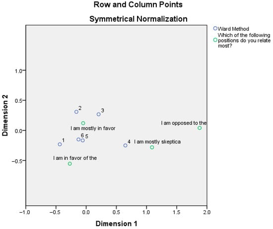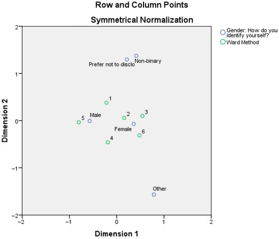 When exploring the relationship between gender identification and respondents’ priorities, as indicated by the six clusters previously identified, a chi-square test revealed a statistically significant association (p = 0, df = 20). To search deeper for patterns and relationships in the data, we applied correspondence analysis. The analysis yielded two principal dimensions that together account for a substantial 96.9% of the total variance observed in the associations.
