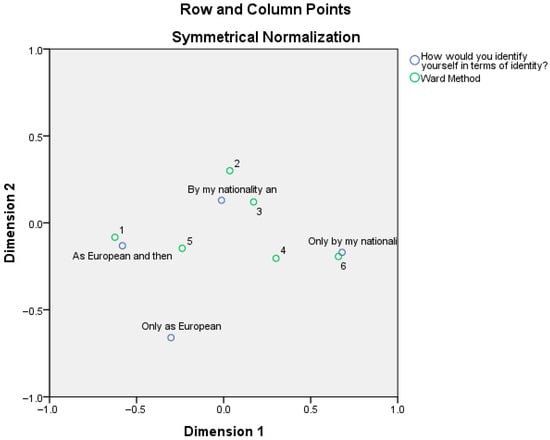 43]. This technique was employed to visualize and understand the relationships between the priority profiles (based on the PCA and clustering) and all other variables. By pairing the priority profiles with the rest of the variables, we could discern how these elements connected and interacted with one another, offering deeper insights into the patterns and relationships inherent in the data. In the first step, we analyze identity (1: European, 2: European and then national, 3: National and then European, 4: National) and attitude towards the EU (1: opposed, 2: sceptical, 3: mostly in favor but it could be better, 4: in favor). In the next step, we analyze the six profiles on priority issues with identity and attitude towards Europe to investigate whether attitudes and issues that a citizen sets as a priority correlate to their attitude towards the EU in general and their perceived identity as a European. In the next step, we proceed to analyze the country of origin with the issues and then with the rest of the demographic variables.