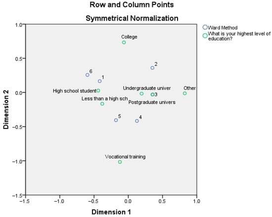 A statistical examination between education levels and the six identified issue clusters revealed a significant association, confirmed by a chi-square test (p = 0, df = 30). Looking deeper into this relationship through correspondence analysis, two principal dimensions emerged, accounting for 82.4% of the overall variance in the data.