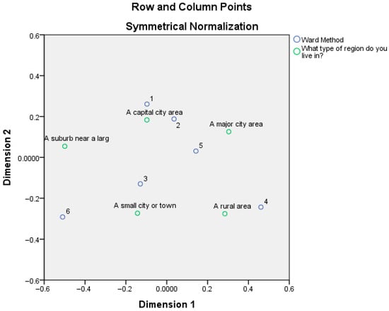 A robust statistical relationship between the type of area in which participants reside and their concerns, as represented by the six issue clusters, was established, affirmed by a chi-square test (p = 0, df = 25). When conducting a correspondence analysis to gain a more nuanced understanding of this relationship, two pivotal dimensions were identified, together explaining 75.9% of the total inertia in the data.