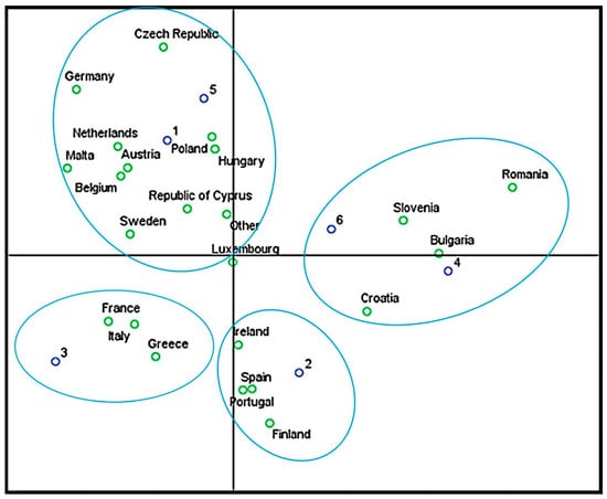 A cross-national comparative approach is now followed when correspondence is applied for the six issue clusters and the country of origin. Chi-square test rejects the independence hypothesis; therefore, the two characteristics are significantly correlated (p = 0, df = 130).