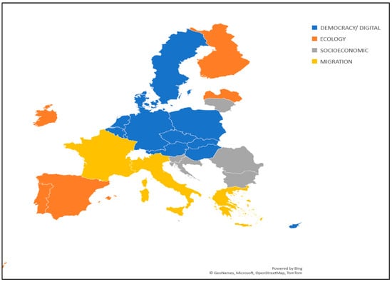 Cross-national analysis further highlighted divergent youth perspectives shaped by national contexts. Young people from Germany, Austria, and the Netherlands displayed strong pro-EU sentiments and prioritized democratic and digital themes. In contrast, youth from Romania and Bulgaria expressed economic and social concerns while showing weaker identification with Europe. Mediterranean countries (e.g., Greece, Italy, France), facing ongoing migration pressures, emphasized that issue more heavily, consistent with findings from European migration studies [