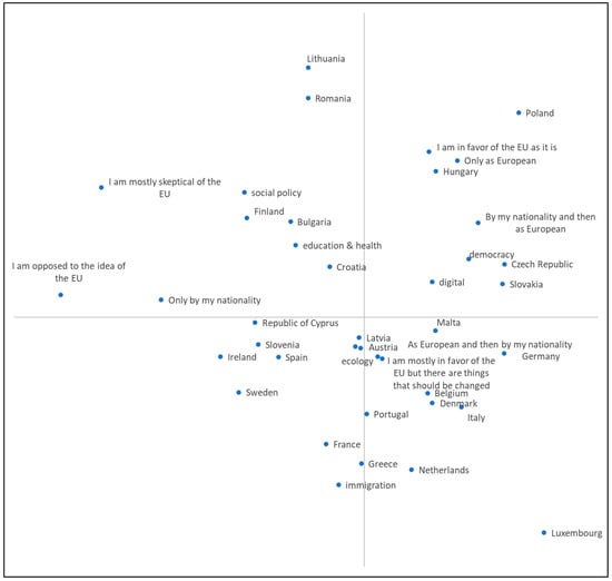 In a second application, a Multiple Correspondence Analysis (MCA) is used to jointly analyze the most important variables of this analysis, to map the various groups of countries not only with reference to issues but also identity and stance towards the EU. MCA positions all items of all the variables in the same dimensions, providing an explanatory map of the phenomenon, bringing together groups of similar objects, highlighting the differences and the polarization between distant objects. The outputs of the analysis, the dimension scores, and the biplot (
