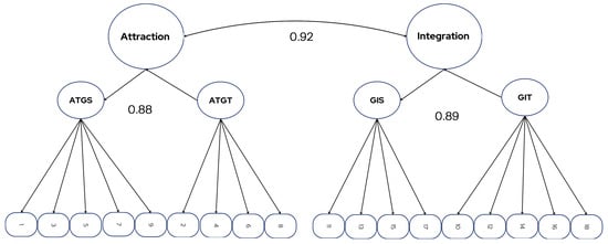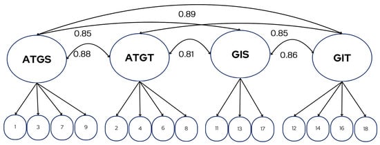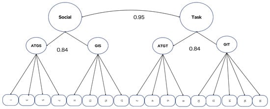 The results obtained from the reliability indices after the elimination of these items (see Table 3) show that the Individual Attraction to the Task (ATG-T) scale has the highest reliability values, with ω = 0.80 and α = 0.80. This scale is followed by the Integration-Task (GIT), which shows ω = 0.73 and α = 0.71. On the other hand, the Individual Attraction to the Task scale in its social dimension (ATG-S) reports values of ω = 0.71 and α = 0.61. In contrast, the Degree of Integration-Social (GI-S) scale shows the lowest internal consistency indices, with ω = 0.52 and α = 0.50. These results suggest that the ATG-T, ATG-S, and GI-T scales have an adequate level of reliability, indicating a high degree of homogeneity between their items.