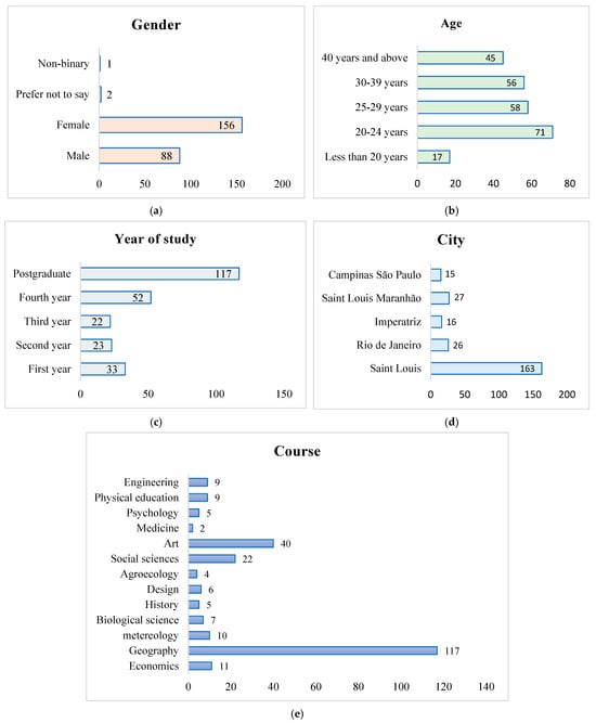 (a): Gender of respondents; (b): Age; (c): Year of study; (d): City where university is located; (e): Course of study.