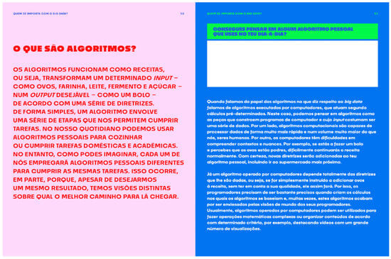 The third case study shows the production of educational content and its appropriation in a pedagogical project with undergraduate students. Acknowledging a gap in resources about big data literacy available in Portuguese, Kubrusly dedicated her master’s thesis [] to the creation of a manual to promote the big data literacy of adolescents aged 14 to 17. To map the scientific literature on youth’s big data literacy, in February 2023, an integrative review was conducted to understand how big data literacy is conceptualized and operationalized, mapping theoretical frameworks and other concepts associated with it []. Then, a scoping review was dedicated to empirical research done on children, adolescents, and young adults [].