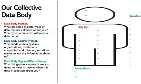 The first workshop model is based on the Digital Defense Playbook [], published by Our Data Bodies (ODB). ODB is a U.S.-based nonprofit association, based in the marginalized suburbs of the cities of Charlotte (North Carolina), Detroit (Michigan), and Los Angeles (California). ODB aims to defend human rights and social justice in relation to surveillance and datafication processes, thereby focusing on how data are collected from communities that are already marginalized by ethnicity, class, gender, sexual identity and orientation, and then stored and used by public and private actors, potentially amplifying pre-existing inequalities and forms of discrimination [,]. ODB produced a playbook with several educational activities aimed at making people more aware of datafication processes and the potential of forms of community organizing. Three interventions organized by Pronzato in spring 2023 were based on this resource. Specifically, he adapted in Italian and expanded the workshop “Your Data Body” []—an activity designed to help participants explore their digital selves by reflecting on how physical characteristics, behaviours, and personal needs are transformed into data by both public and private entities, and to consider potential forms of resistance. While the original workshop focused on surveillance activities enacted by state actors, Pronzato decided to situate the analysis on datafication processes enacted by private platforms such as social media and streaming services. The workshop includes three exercises, namely, examining various digital platforms to identify the types of data extracted from users, the systems and organizations that collect and manage these data points, and the underlying needs users attempt to fulfil within these datafication processes (see Figure 2). Then, participants are asked to draw their own data bodies under the surveillance of contemporary public institutions and tech companies, and then to imagine their data bodies free from this surveillance.