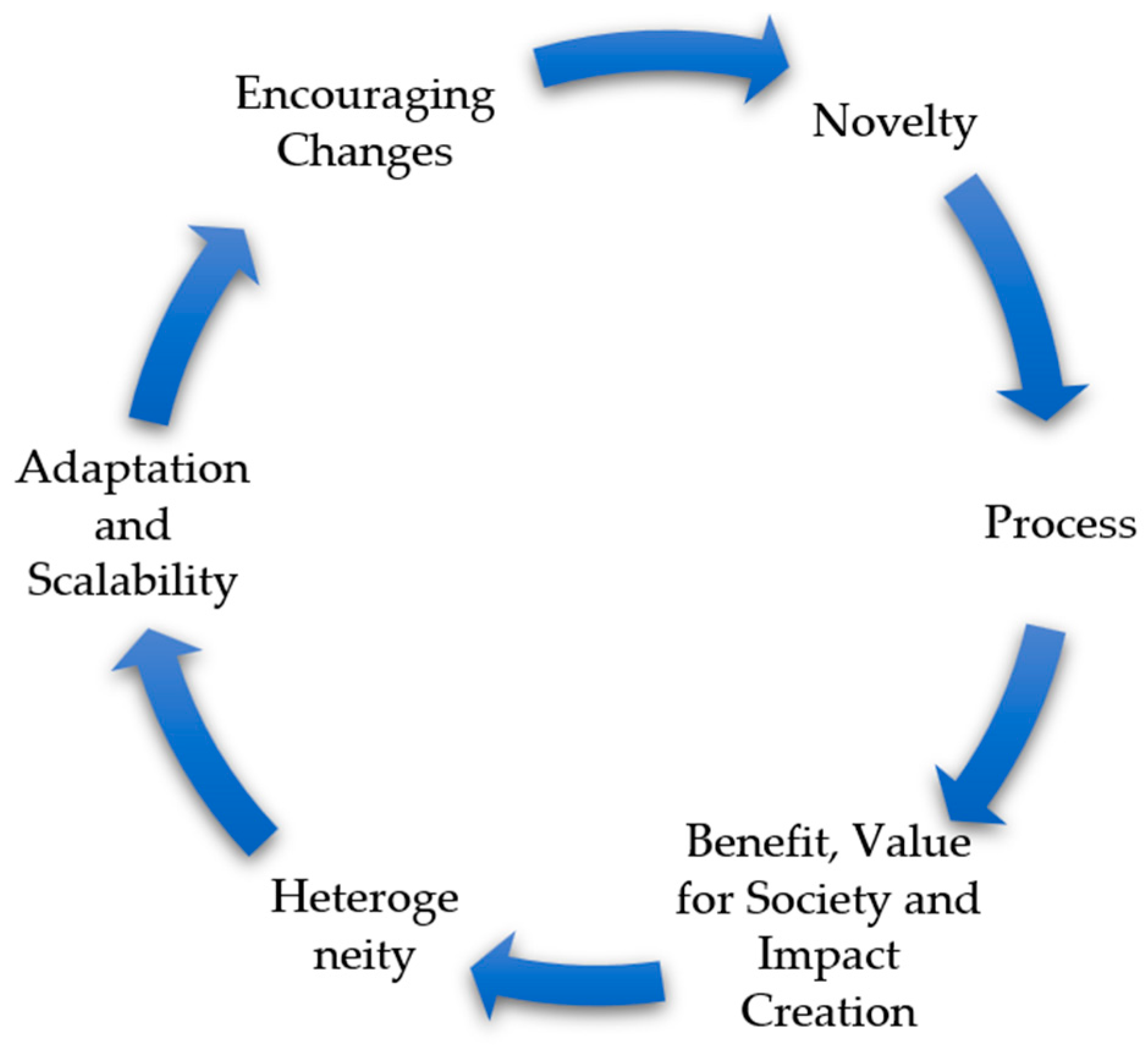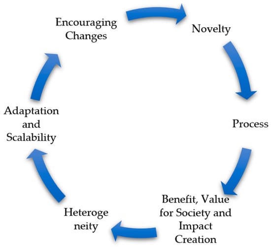 48]. The process of social innovation typically unfolds through several interrelated stages: (1) novelty, where a new idea or approach emerges to address unmet or inadequately met needs; (2) process, where the innovation is developed and embedded in social practices through co-creation, experimentation, and institutional adaptation; (3) heterogeneity, reflecting the diverse actors, sectors, and knowledge systems involved; (4) benefit and impact creation, where the innovation demonstrates measurable improvements in individual and societal well-being; (5) encouraging change, as the innovation challenges existing power structures or institutional logics; and (6) adaptation and scalability, which assess the innovation’s potential to be replicated, transferred, or expanded in other contexts [
