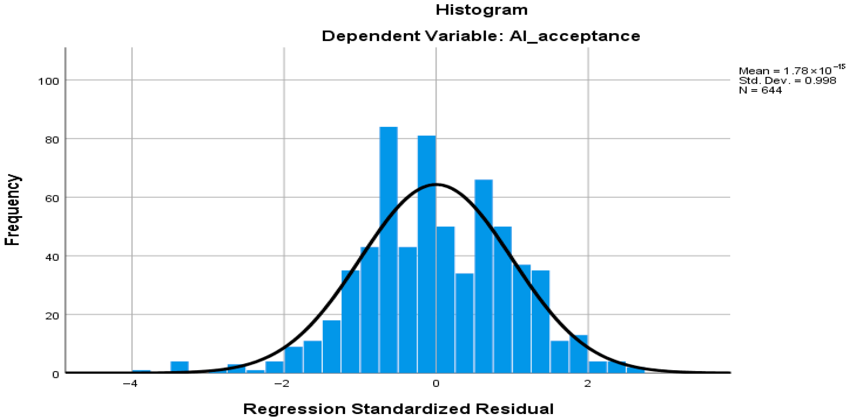 To assess the assumption of normality of residuals, a histogram of standardized residuals for the dependent variable AI acceptance was generated (