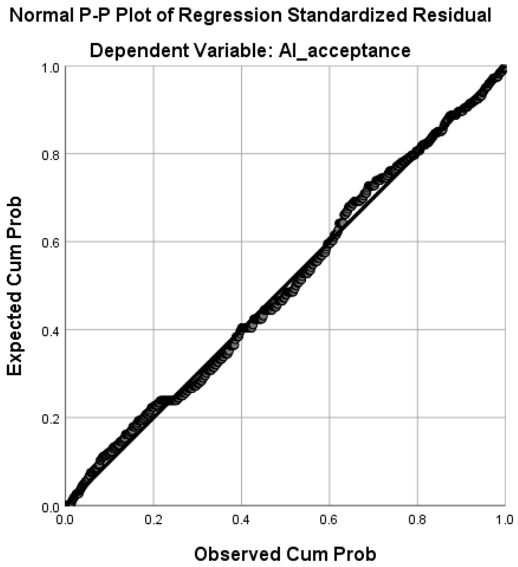A Normal Probability–Probability (P–P) Plot was created to evaluate the normality assumption of the standardized residuals of AI acceptance (