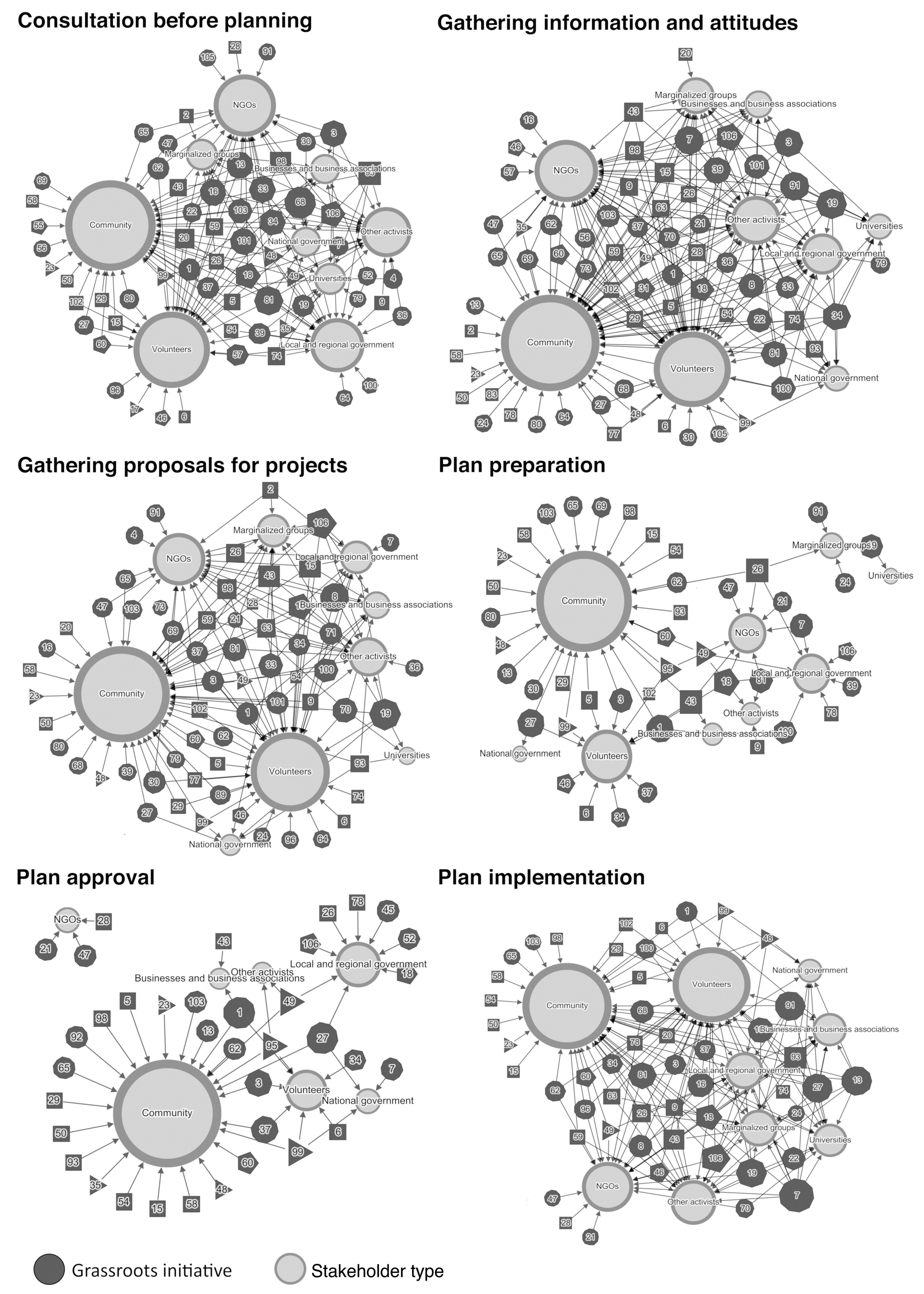 In the individual networks, we observed different variations in the degree distribution of both grassroots initiatives (variability in the number of types of stakeholders they involved) and stakeholders (variability in the involvement of individual types of stakeholders). In the case of the grassroots initiatives’ degree, the variation was relatively high in all of the networks. At the same time, the median degree was low, even zero in the case of the last three networks. This indicates the presence of a group of centrally positioned high-degree initiatives and, at the same time, a large number of peripheral actors with a very limited level of stakeholder involvement. In the case of low-density networks, this mainly indicates a different rate of involving “any” type of stakeholder in the given planning phase, evident in the relatively high isolate rates. This is clearly shown in the visualization, as, in the networks of higher density, we observe numerous groups of actors with a central position, who involve a relatively wide spectrum of stakeholders. In the low-density networks, the choice of stakeholder involvement is often reduced to one type of stakeholder and initiatives with multiple ties are almost non-existent.