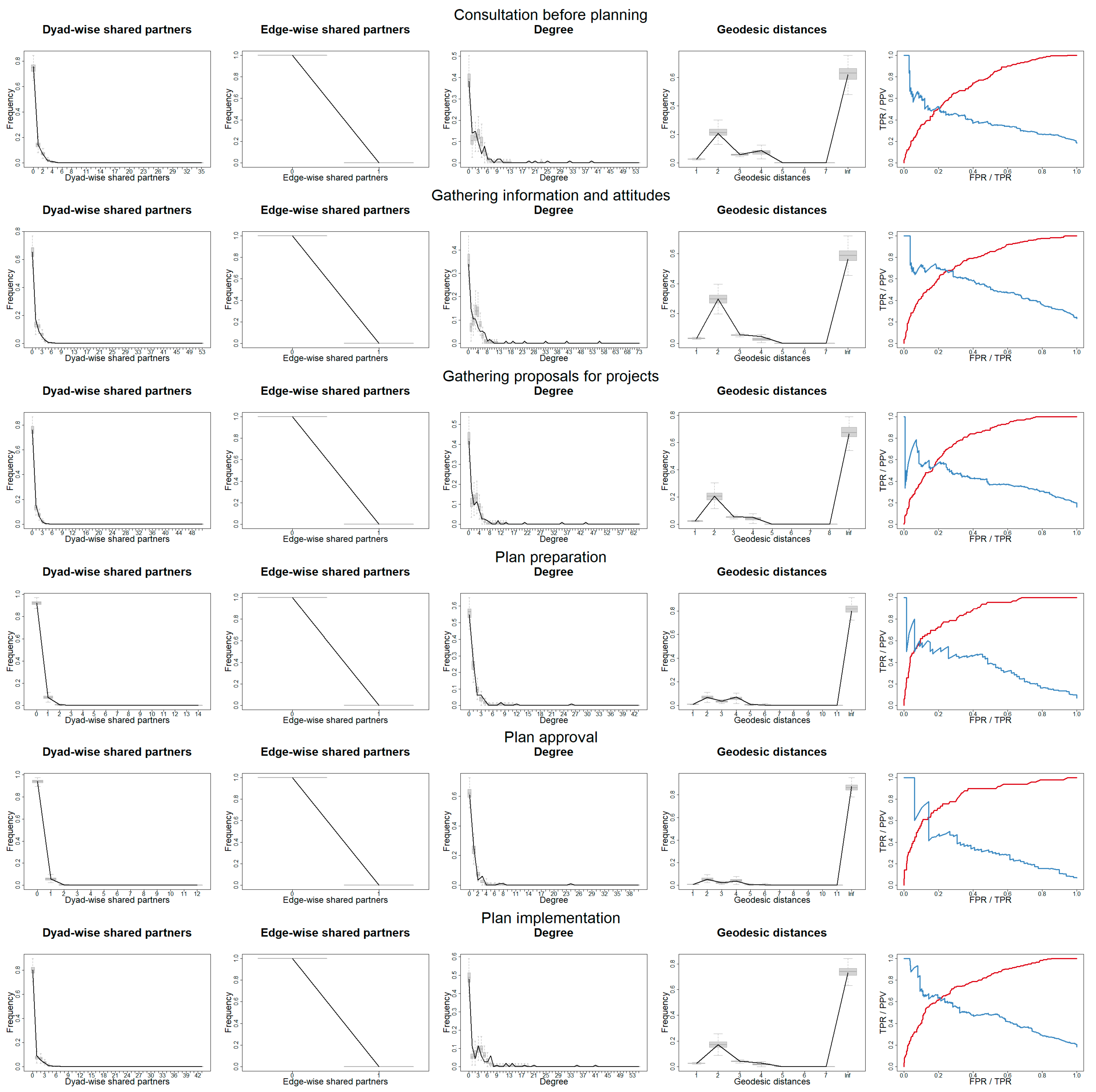 In contrast, ties to institutional actors such as local and regional governments, business associations, and universities appear to be more selective, with only a subset of initiatives engaging them at each stage. However, noticeable differences can be observed across the individual phases. A slightly higher involvement of these stakeholders is visible in the first three networks as well as in the plan implementation phase, though these are denser networks, making it difficult to identify the targeted involvement of these actors. It is important to note that the plan approval network does not contain ties with universities nor with marginalized groups. In the case of this network, these stakeholder nodes were removed, in order to proceed with the ERGM analysis in subsequent stages. In the context of H1, which expects that, in phases I–III, grassroots initiatives are most likely to include the local government, it is evident that while local and regional governments are not dominant actors, they maintain a stable position that persists in these three phases as well as in the other networks.