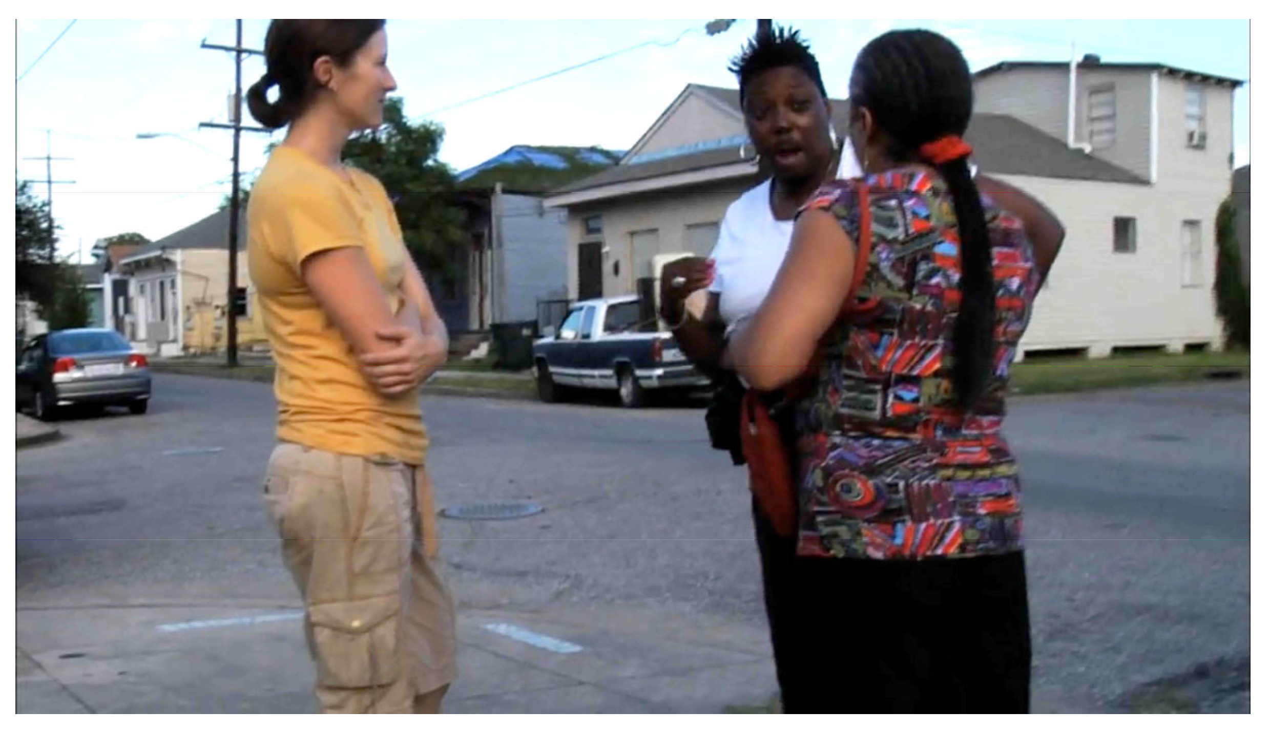 Architecture School, we see and hear NHS staff as they perform this balancing act through instances of explicit and indirect conflict between local residents and NHS staff, in particular, through the experiences of Anderson as CEO. One notable depiction of tension between Lauren and a long-standing resident of Central City, Tess Lassai, occurs early in the series in episode one, where we see and hear that Tess’s daughter, Nikkol, was refused an NHS financial subsidy to purchase the previous year’s URBANbuild home (Tulane students design and build a house annually). In the following excerpt of talk from that episode, Tess meets with NHS CEO, Lauren, in the presence of the Tulane URBANbuild program’s project manager, Emilie Taylor Welty (Welty has long-standing relationships with Central City due to her sustained involvement in the design–build program [