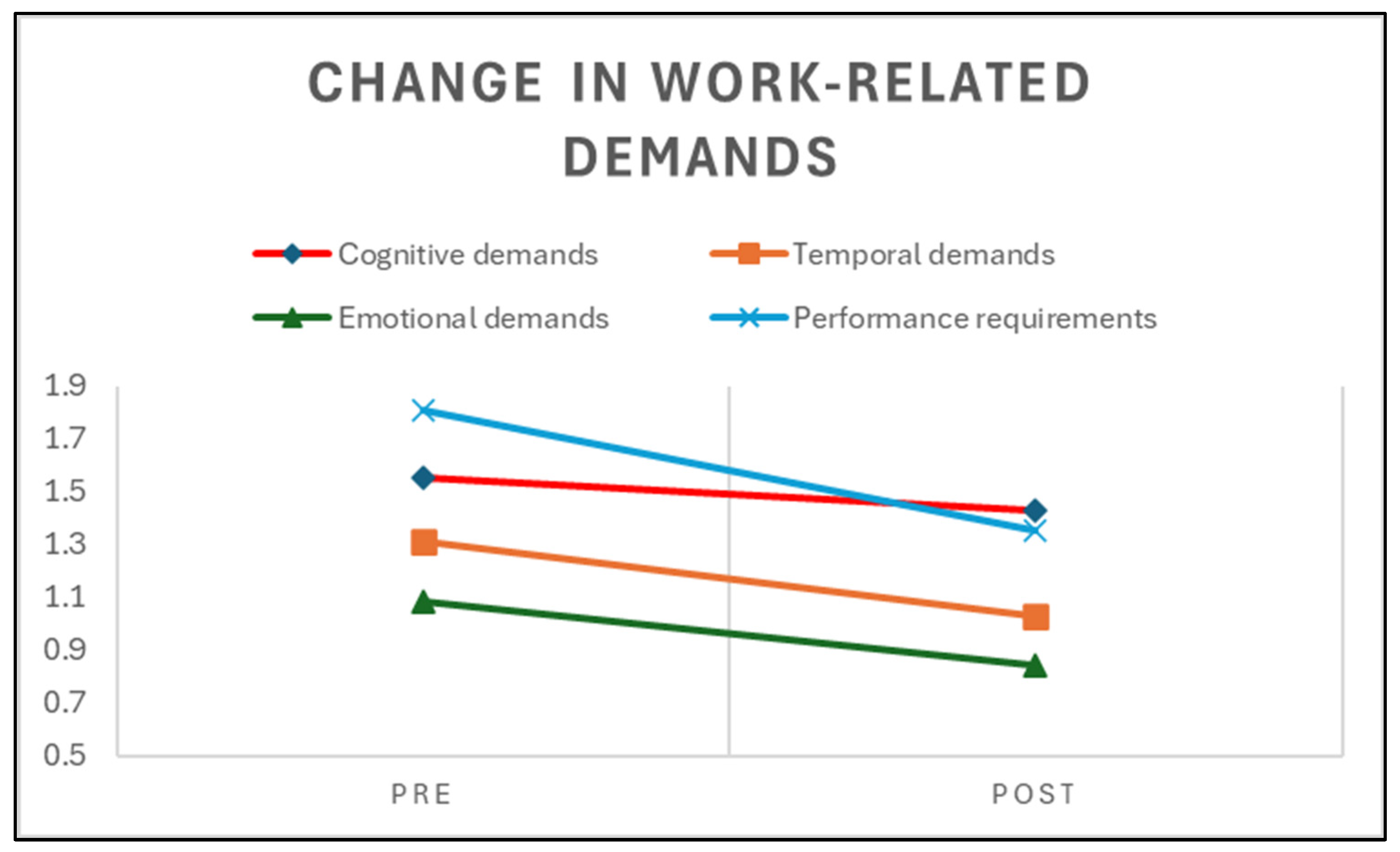 t-tests can increase the risk of Type I error, this approach was selected to provide an initial comparison of intervention effects and identify potential trends in psychosocial demands and mental health outcomes. Future studies with larger samples would benefit from more robust statistical approaches, such as repeated-measures ANOVA or linear mixed-effects models, which can account for within-subject correlations and improve statistical power.