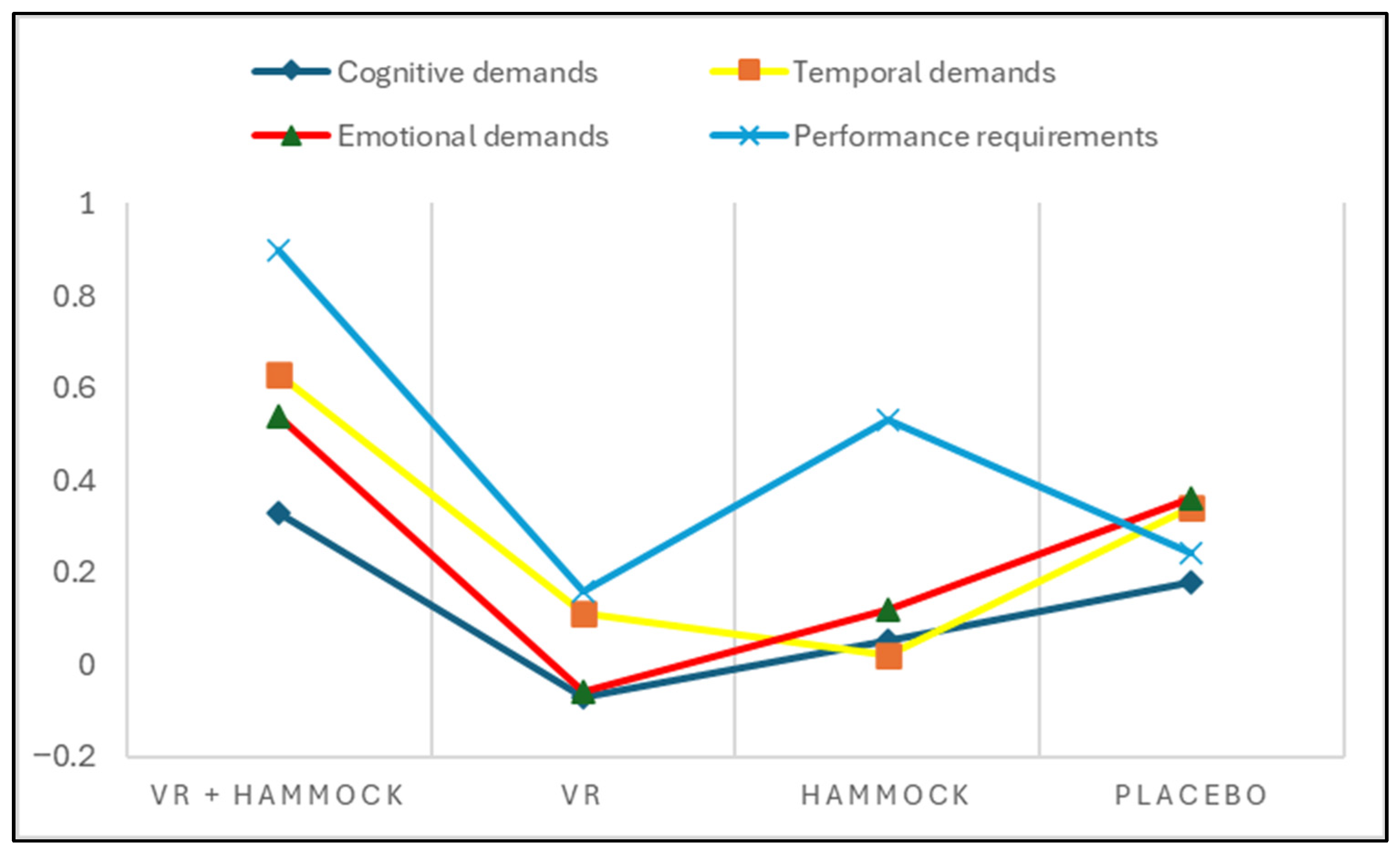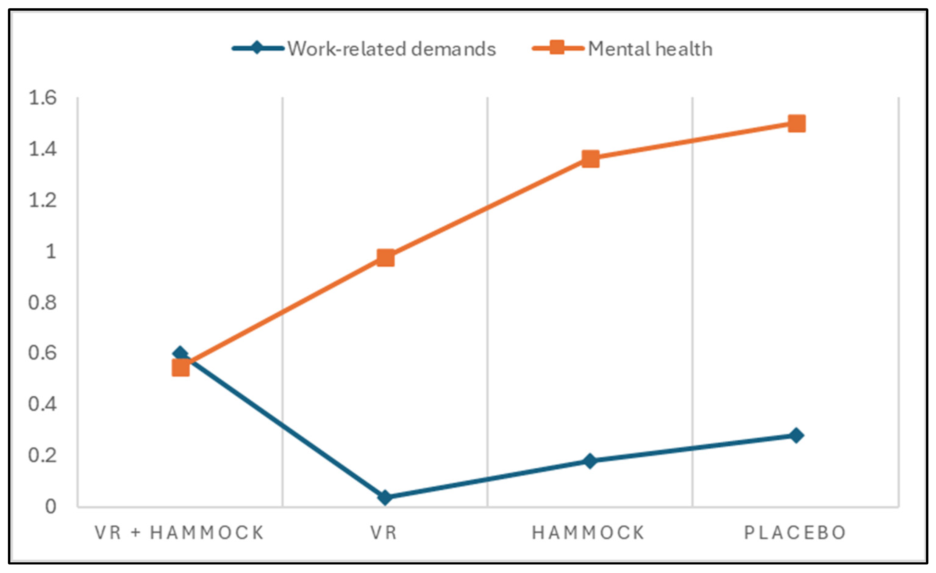 The comparative analysis between experimental conditions revealed important nuances. The combined intervention of VR and GPR using the hammock showed the greatest benefits in reducing emotional demands and performance requirements, supporting the hypothesis that the integration of physical and psychological strategies can enhance both relaxation and detachment from work-related stressors. These results are consistent with previous research highlighting the efficacy of multicomponent interventions that simultaneously address the physical and psychosocial dimensions of occupational well-being, improving both musculoskeletal health and mental well-being [
