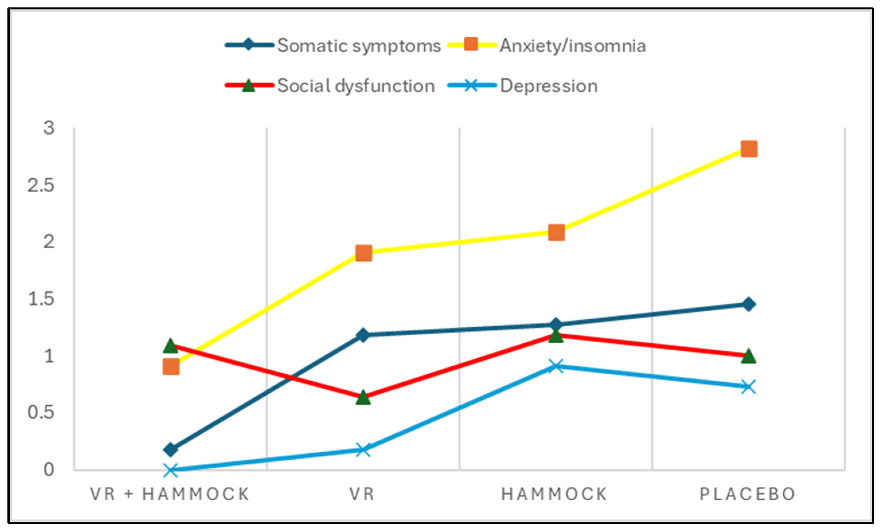 Participants were assigned to the experimental conditions in order of arrival. The first participant was allocated to the hammock (GPR) condition, the second to the Virtual Reality (VR) condition, the third to the combined VR + Hammock condition, and the fourth to the control/placebo condition. This sequence was then repeated for subsequent participants, resulting in a quasi-random assignment across groups.