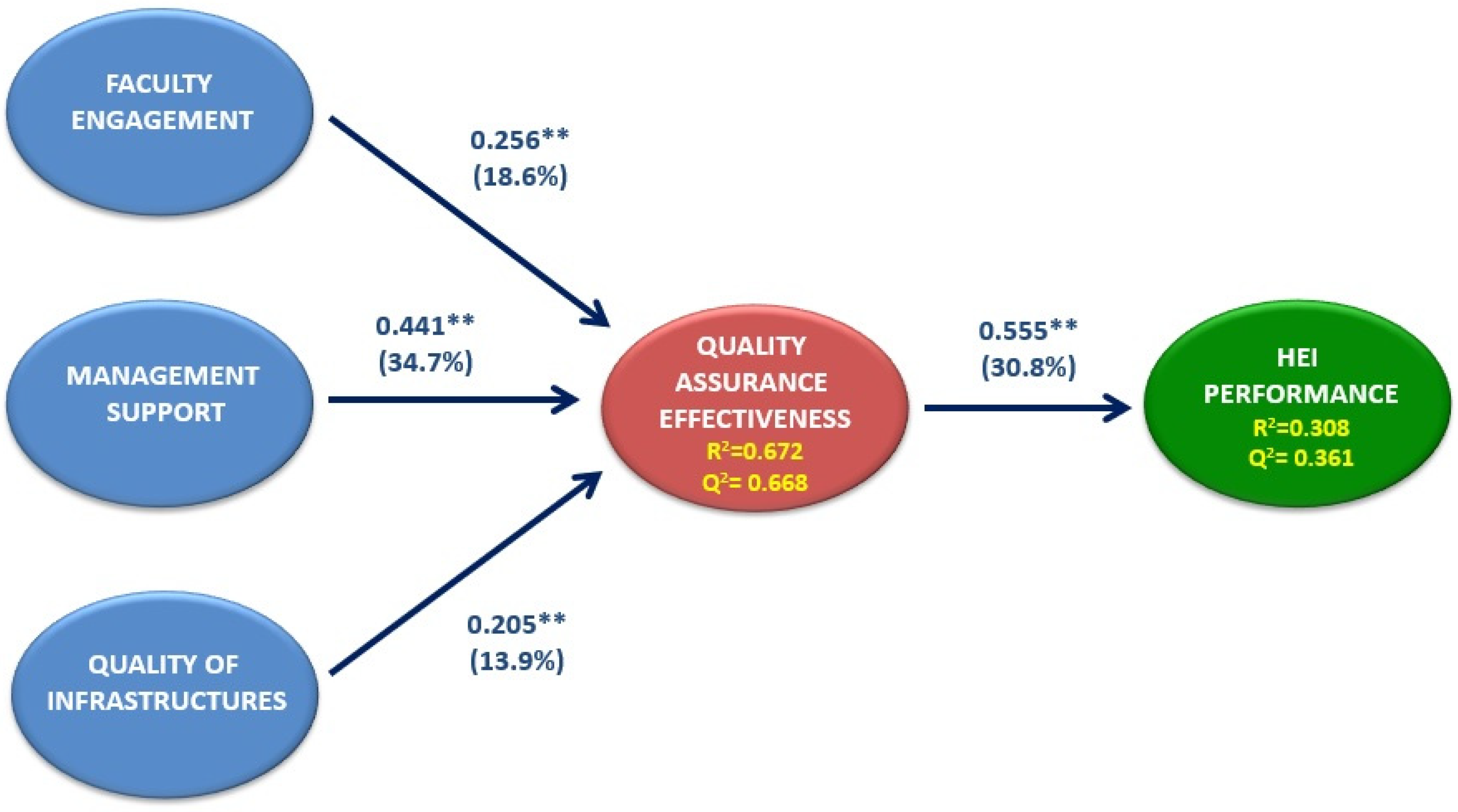 Management support is the construct that most contributes to explaining QAE (34.7%). The variables faculty engagement (18.6%) and quality of infrastructures (13.9%) also have a high explanatory power of intention. Our model also confirms the positive impact of the QAE on the HEI performance (30.8%).