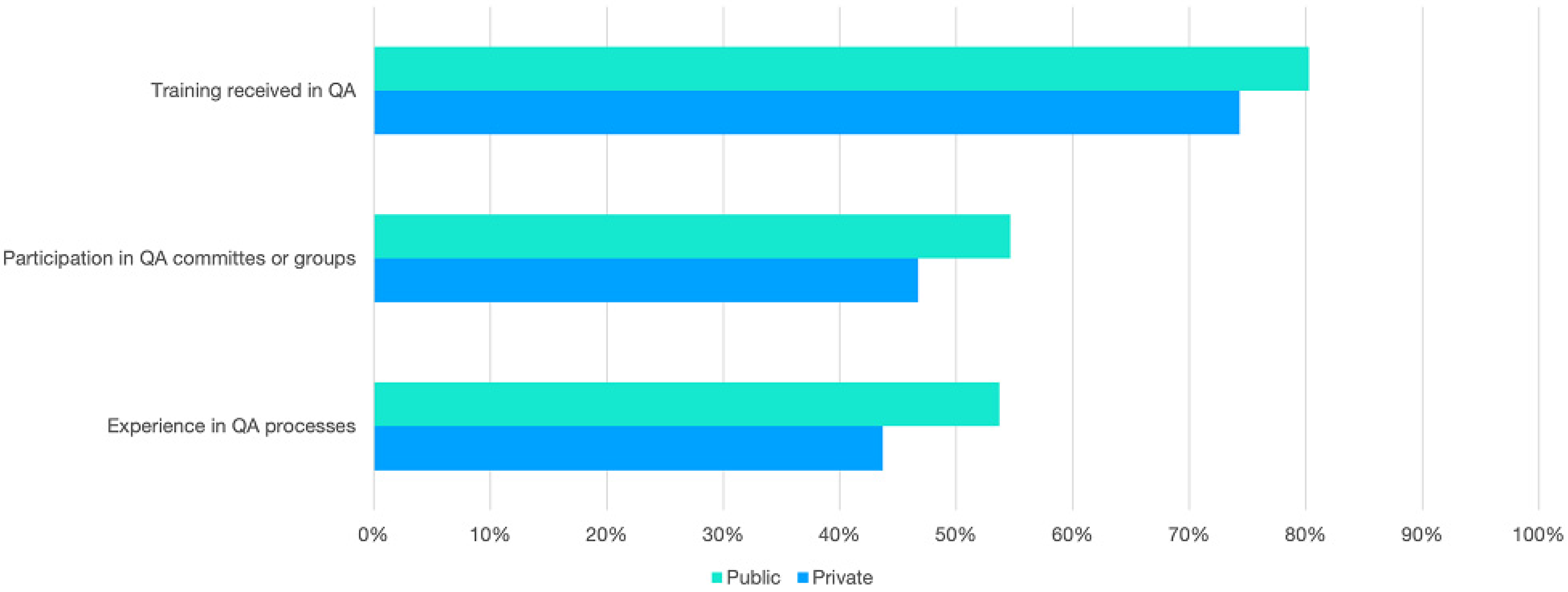 For private HEIs, the lower percentages suggest a need to enhance their QA initiatives. These institutions may benefit from investing more in QA training programs to ensure their staff are well-equipped with the necessary skills and knowledge. Increasing participation in QA committees and groups can also foster a culture of quality and continuous improvement within the institution.