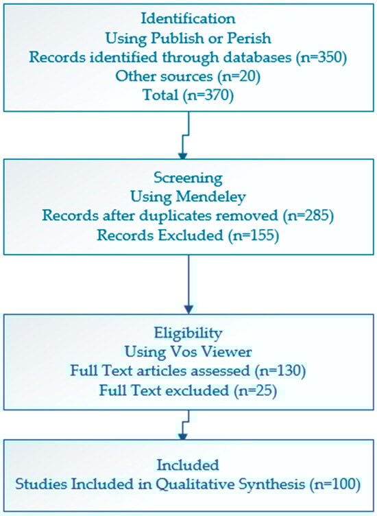 Records were identified through database searches in Scopus, Web of Science, and Google Scholar (n = 350), with additional records identified through reference list screening (n = 20), resulting in a total of 370 records. After duplicate removal, 285 records remained for title and abstract screening. At this stage, 180 records were excluded due to irrelevance to overtourism, absence of an ethical or environmental behavioral focus, or non-tourism contexts.
