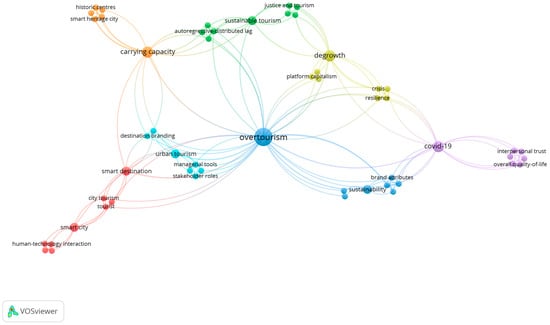 Network visualization of overtourism-related research themes. Note: Figure 2 Keyword co-occurrence network visualization generated using VOSviewer 1.6.20 version. Each node (circle) represents a keyword ex-tracted from the selected publications, where the size of the node indicates the frequency of occurrence of the keyword. The lines between nodes represent co-occurrence relationships, and thicker lines indicate stronger relationships. The different colors represent clusters of related keywords, automatically generated by the VOSviewer clustering algorithm, illustrating thematic groupings within the overtourism research literature.