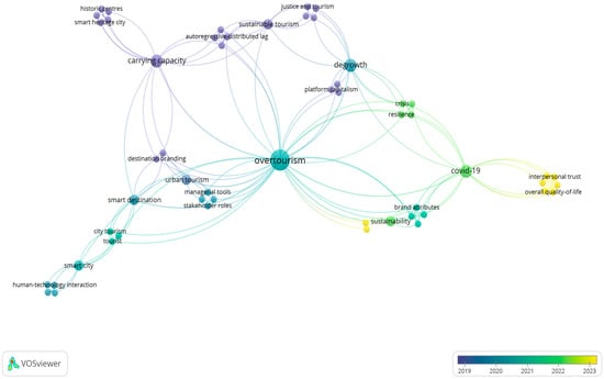 The overlay map shows an evolution in research topics from carrying capacity and smart destination approaches (2019–2020) toward COVID-19, resilience, and sustainability (2021–2023). More recent publications highlight resilience, brand attributes, quality of life, and sustainability, but still remain structured around systemic adaptation and destination recovery and not ethical transformation or behavioral change. The absence of emerging terms related to environmental ethics, pro-environmental identity, moral norms, or ethical consumption suggests that, despite the pandemic reshaping tourism discourse, research still prioritizes macro-level recovery strategies over micro-level ethical behavior. Therefore, there is a temporal gap where post-pandemic tourism scholarship has not sufficiently integrated socio-psychological determinants of environmental behavior into overtourism debates. Node size represents the frequency of keyword occurrence, while link thickness indicates the strength of co-occurrence relationships. The color gradient reflects the average publication year of keywords, ranging from earlier studies (cooler colors) to more recent studies (warmer colors). This visualization illustrates the temporal evolution of research themes within overtourism scholarship (Figure 3).