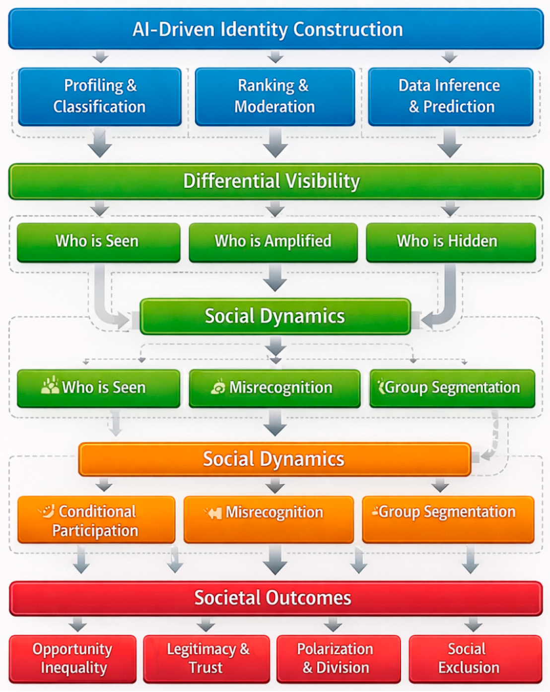 The central argument developed here is that AI-driven platforms increasingly operate as social infrastructures. They perform functions traditionally associated with institutional power: classifying social actors, setting behavioural boundaries through moderation, and structuring participation through exposure rules [1]. Digital identity is where these functions converge. It is the interface through which individuals encounter the platform, but also the channel through which platforms sort people into categories that carry durable social consequences. These consequences are rarely experienced as explicit decisions. They appear instead as reach, traction, reputational standing, friction, or quiet disappearance. Yet their cumulative effects are political in a precise sense: they distribute legitimacy, opportunity, and voice unevenly across society [3,4]. Figure 1 visualises this conceptual pathway, tracing how AI-driven identity construction feeds into differential visibility, participation, recognition, and downstream societal outcomes.