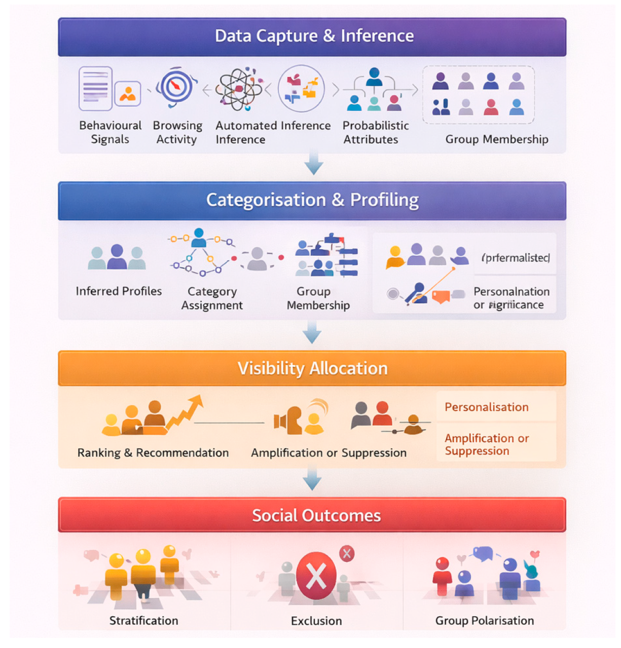 Where earlier social theory treats identity as something negotiated through interaction and recognition, identity in AI-mediated platform environments is increasingly produced through a quieter but more consequential mechanism: automated inference. What users experience as self-expression is only one input into a broader identity pipeline in which platforms capture behavioural traces, infer probabilistic attributes, assign category membership, and circulate these outputs through ranking systems that determine who is seen, by whom, and under what conditions. Algorithmic identity, in this sense, is not simply a profile. It is a governance artefact that is continuously updated, operationalised, and monetised through the allocation of visibility [4,5]. Figure 2 illustrates this pipeline by tracing the movement from data capture and classification to visibility distribution and downstream social consequences.