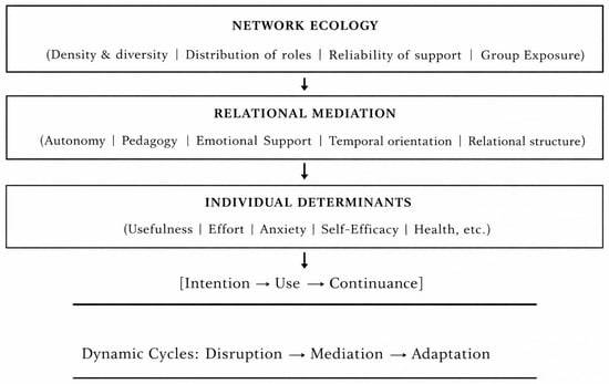 This layered structure situates adoption within relational infrastructures rather than treating social influence as an external variable. Individual determinants are not displaced but relationally conditioned.