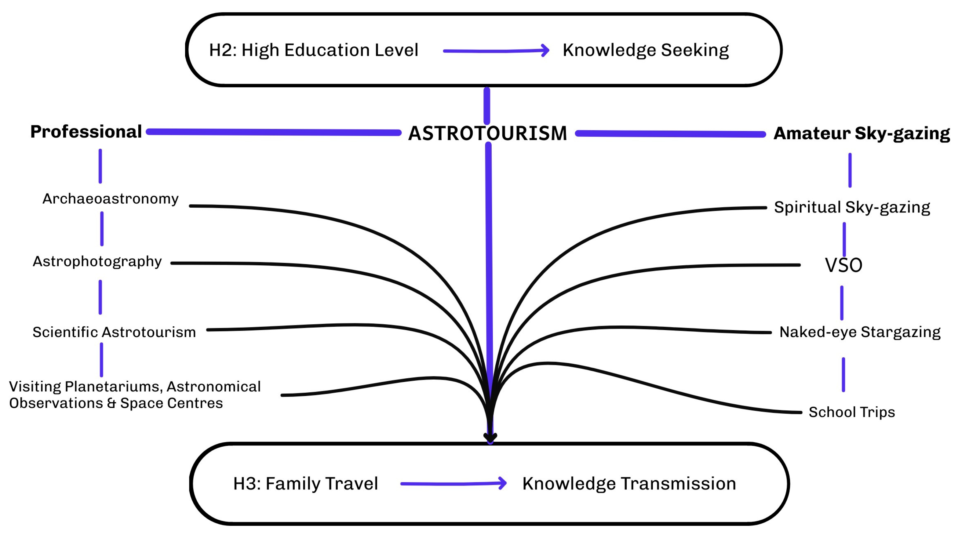 H2 is strongly supported by the demographic data showing 49.39% of participants possess university-level education, significantly exceeding expected frequencies (χ2 = 100.8771, p < 2.2 × 10−16), confirming that astrotourists are highly educated individuals seeking to deepen their knowledge of the sky and cosmos.
