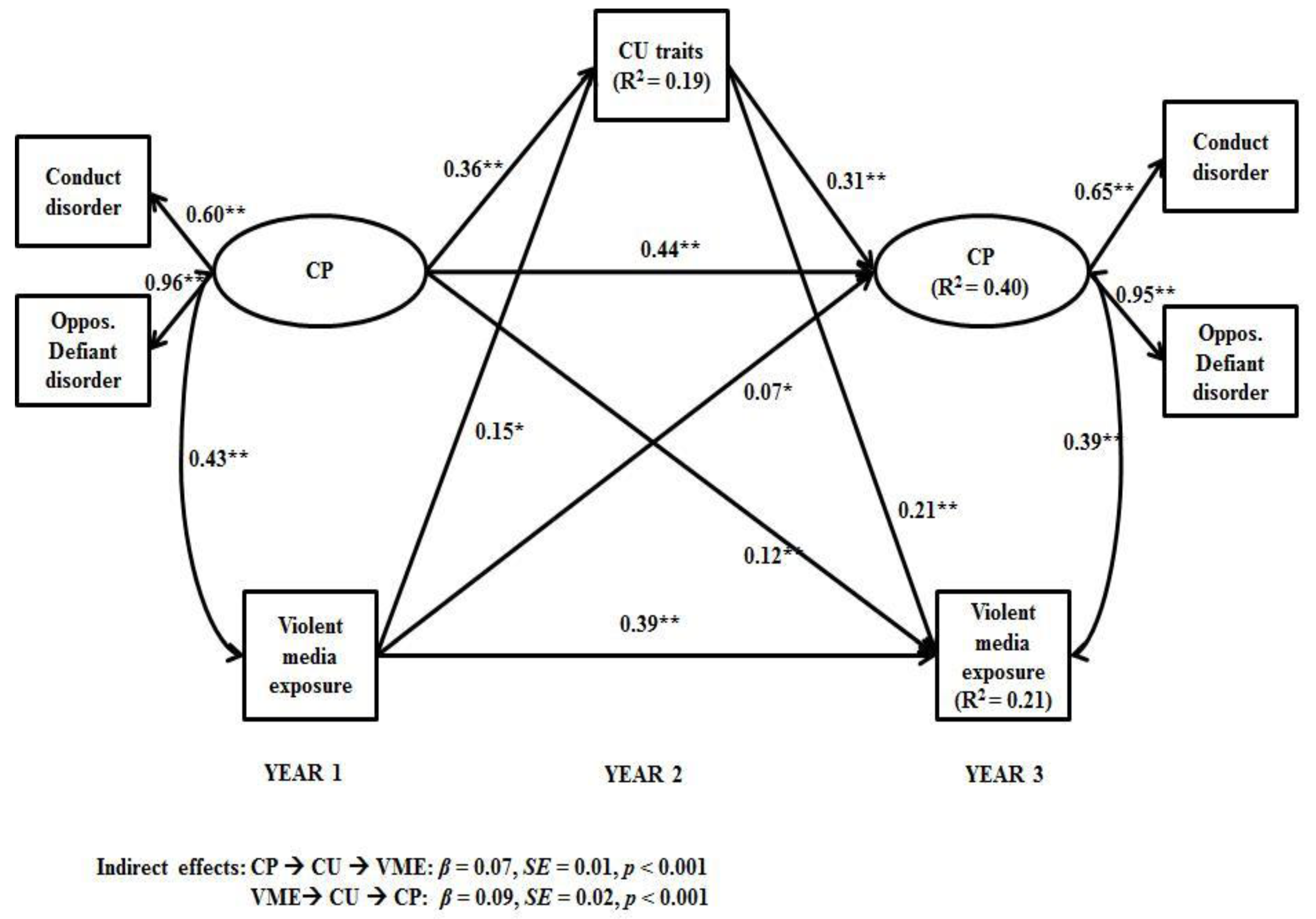 It is particularly important that current research findings replicates prior work and provides additional support that MVE is a precursor of CPs, within a cross-lag longitudinal model. Theoretical perspectives, such as social learning theory (e.g., [80]), provide a potential explanation of this direct effect. Youth, exposed to media violence or violence in other contexts (i.e., community and family) [81], are more prone to exhibit aggressive behavior. However, the present study provides a new perspective in the literature. It was theorized that CU traits, representing a personality variable, will act as an underlying mechanism, explaining the longitudinal effect from MVE to CPs. The role of CU traits as a mediator of this association was supported by the study’s findings, providing evidence for an indirect pathway from MVE to CU traits to CPs, which is in addition to the direct association from MVE to CPs. Indeed, CU traits were found to play an important mediational role in explaining the association between exposure to violence and violent behavior. Kimonis et al. [82] investigated the link between family violence exposure and lifetime violent offending in incarcerated youth. They found that CU traits contributed to the prediction not only of the chronicity, but also of the severity of delinquency exhibited by incarcerated youth. Thus, the present study builds on prior evidence linking different types of violence exposure (i.e., family or community) and CPs by investigating a different kind of exposure to violence, specifically MVE. These findings in combination, suggest that there are multiple risk-factor pathways to understand aggressive and CP behavior in youth; however CU traits seems to be an underlying mechanism explaining the association of environmental risk factors, and more specifically MVE, to behavioral problems [36].