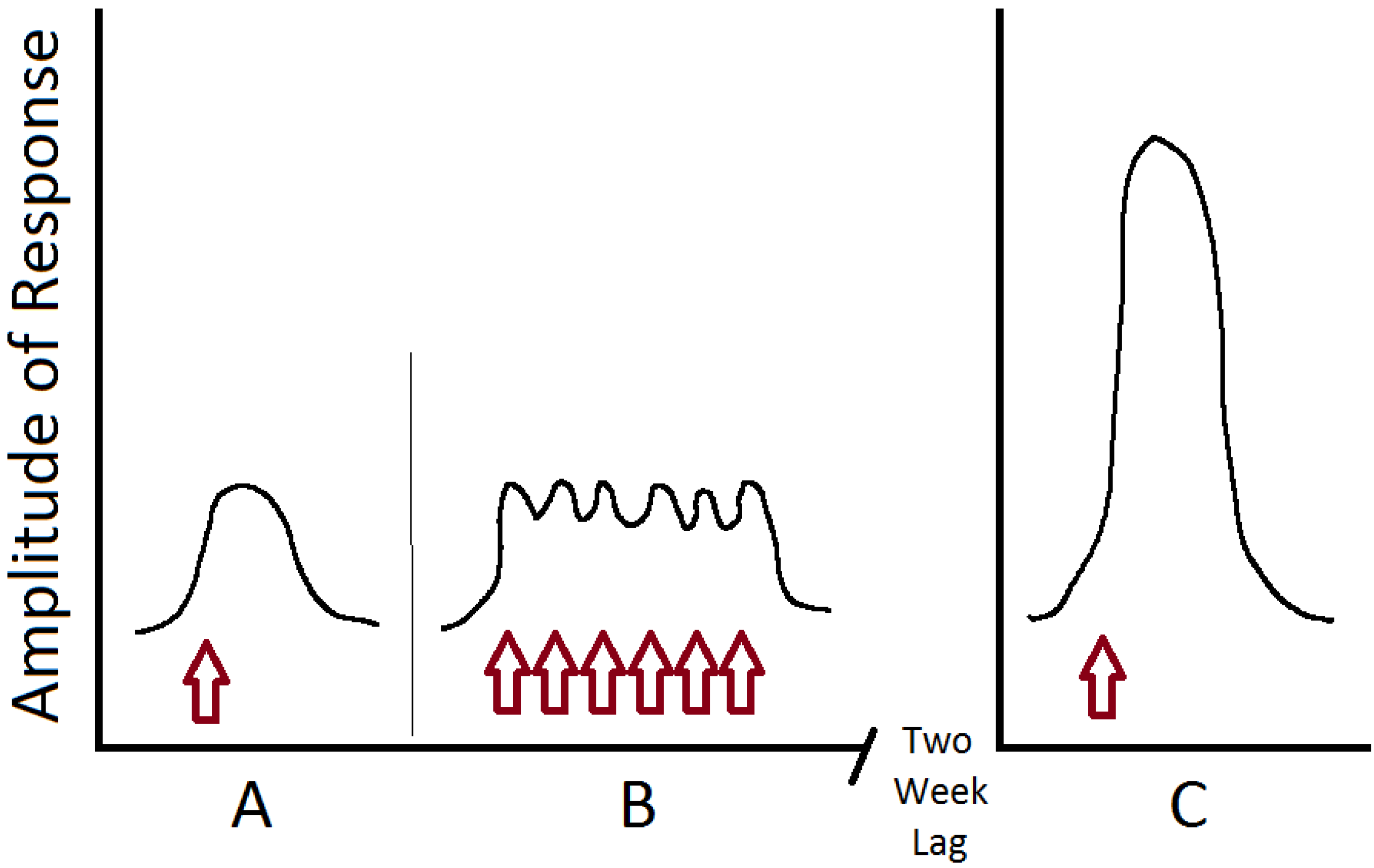 When the neuron is stimulated (for example, if one hears the word “arrow”), it shows an electrical response of a certain magnitude (represented as the height/amplitude of the wave in Figure 1A). If the neuron is stimulated the same way repeatedly as shown in Figure 1B (e.g., hearing “arrow, arrow, arrow, arrow, arrow, arrow”), it has that response repeatedly. This repeated stimulation causes long-term changes in the neuron (generally considered to be permanent, although forgetting does occur), in which the next time the neuron is stimulated, it will now have a much greater response. As shown in Figure 1C, upon hearing the word “arrow” again, the amplitude of the response has now significantly changed. This can happen even if there is a substantial time delay between points B and C (up to weeks). The neuron is now much more likely to respond than it used to. The odds that a given stimulus (“arrow”) will cause an action potential have changed long-term. Simply put, learning has occurred.
