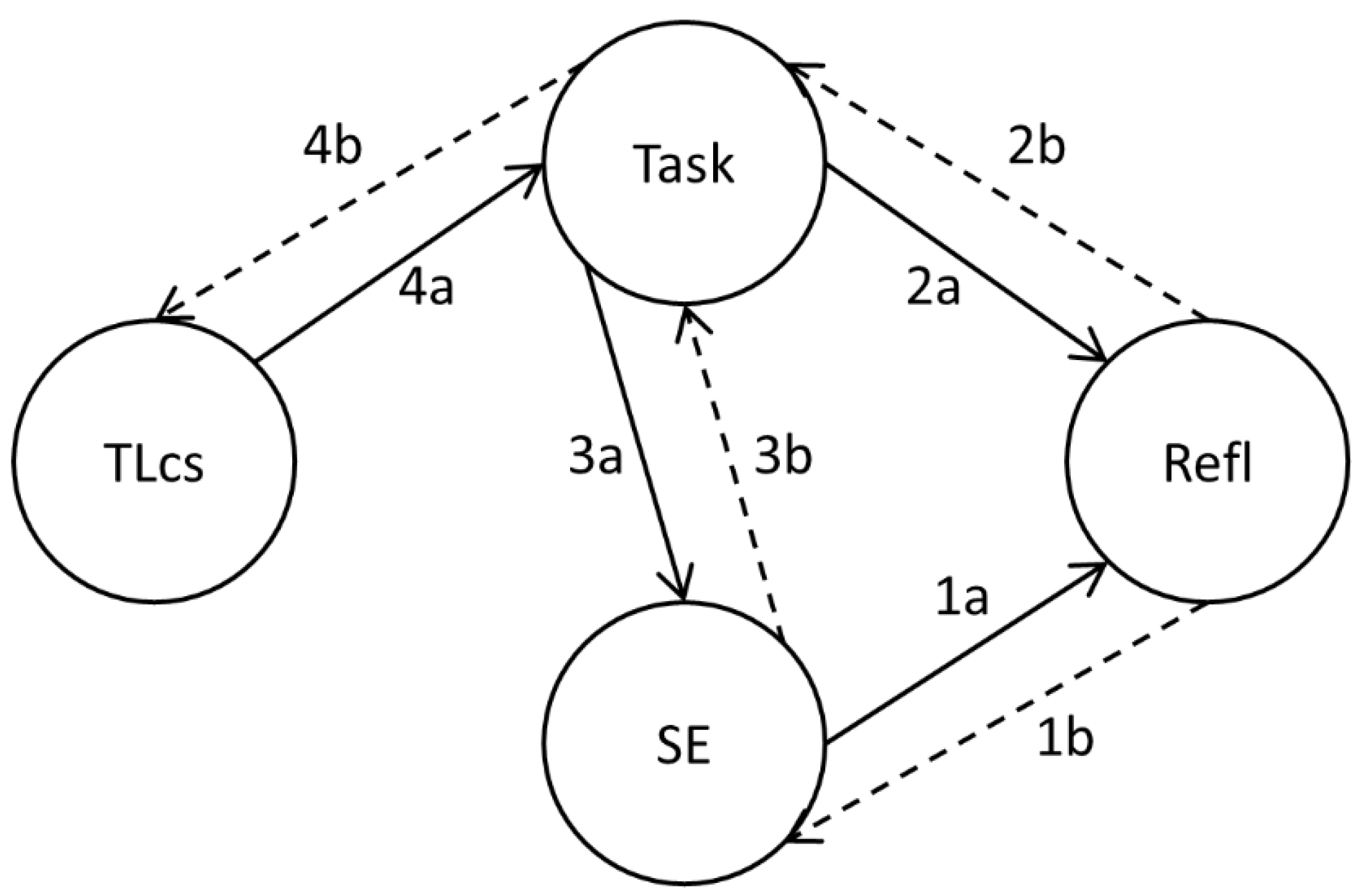 Theoretical framework of how self-reflection (Refl) is influenced by self-efficacy (SE), perceived task interdependence (Task) and the transformational leadership practices individualized consideration and intellectual support (TLcs; solid arrows), as well as the reciprocal relations that will be explored (dashed arrows). The numbers 1a–4b represent the hypotheses.
