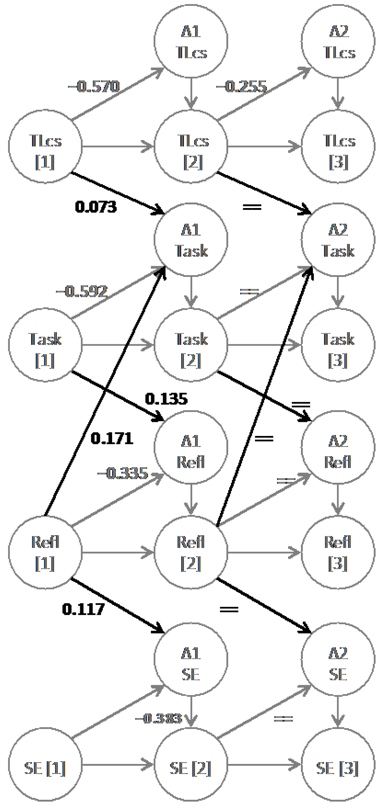 Values in the figure are significant. TLcs = transformational leadership consideration and stimulation; Task = task interdependence; SE = self-efficacy; Refl = self-reflection. TLcs[t] represents its measurement occasion factor at time t. Δ[#]TLcs represents its latent difference factors for subsequent occasions. The black single headed arrows are the invariant couplings from one variable to another (the γ’s) with their values. The double equality signs represent invariance. The bold grey arrows are the autoregressions (β’s) with their values. The grey arrows without values are fixed at 1. TLcs does not have invariant autoregressions, Task, SE, and Refl do. The model is simplified to stress the influences over time and to ease interpretation.