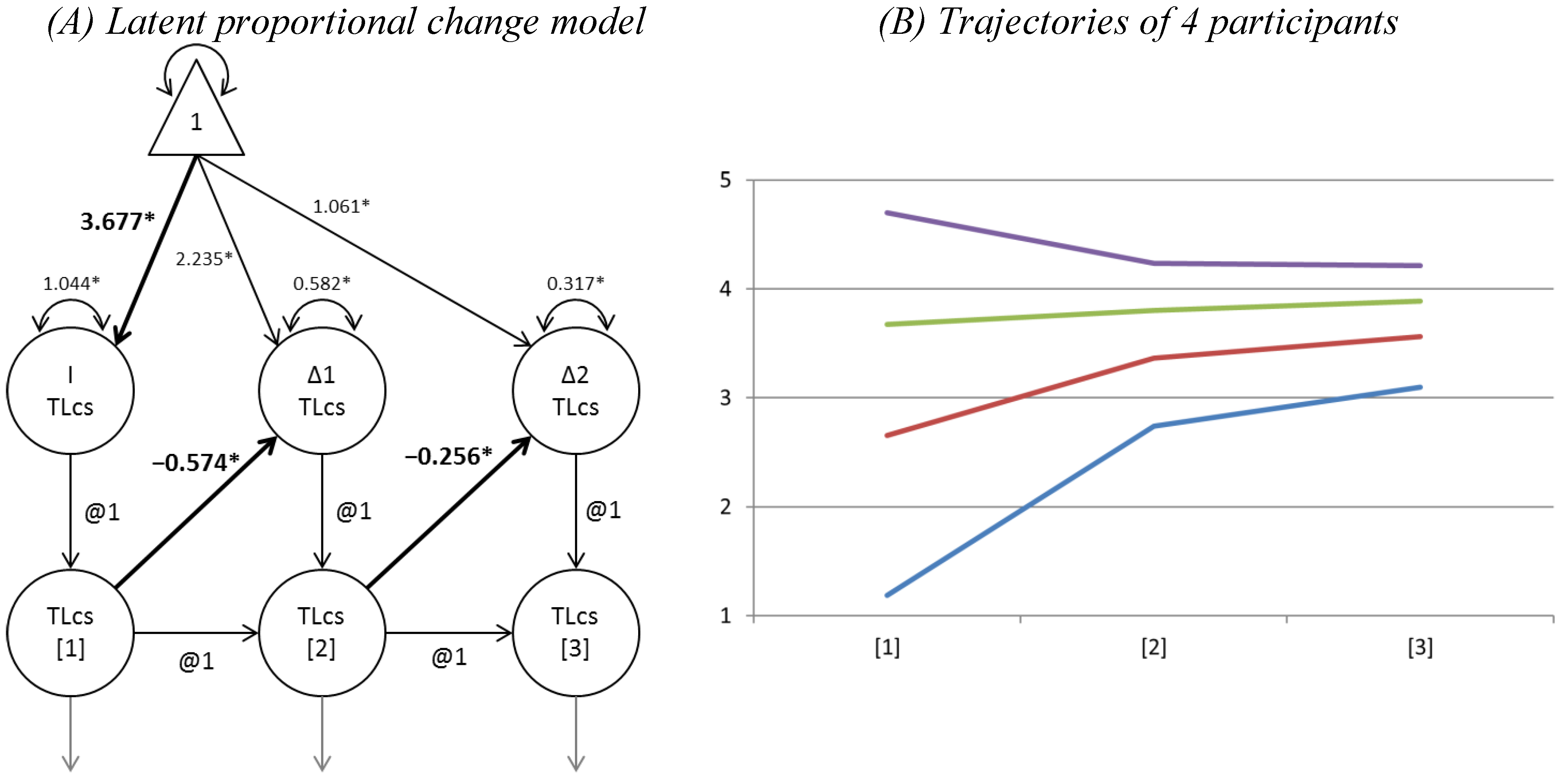 Together they form the so-called dual change score model, in which both components together model the intra-individual change. Changes in the LDS model accumulate over subsequent time points [20,27,94]. For the reader’s complete understanding, a bivariate dual change Latent Difference Score (LDS) model, is visualized and discussed briefly in Appendix 6.