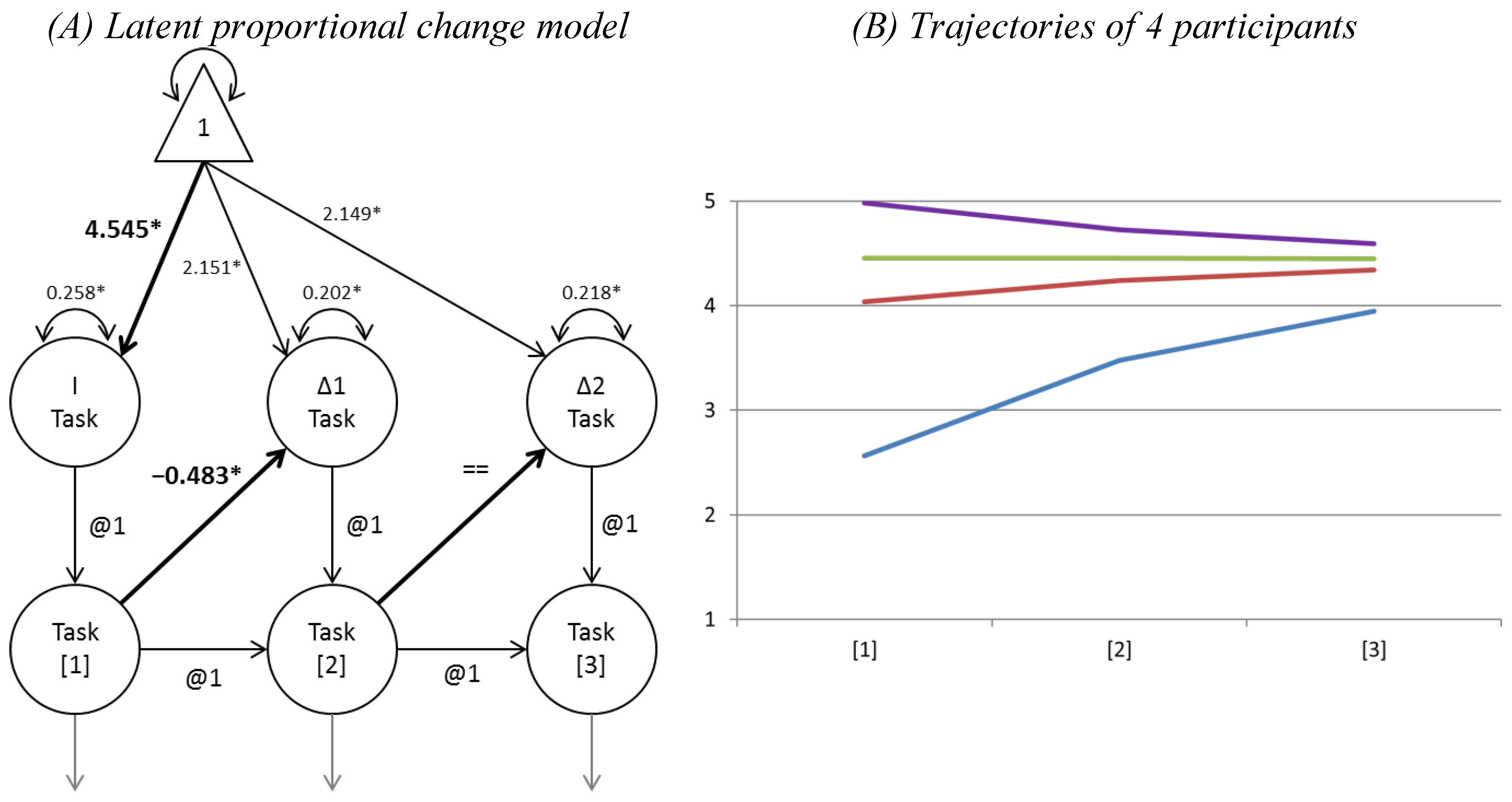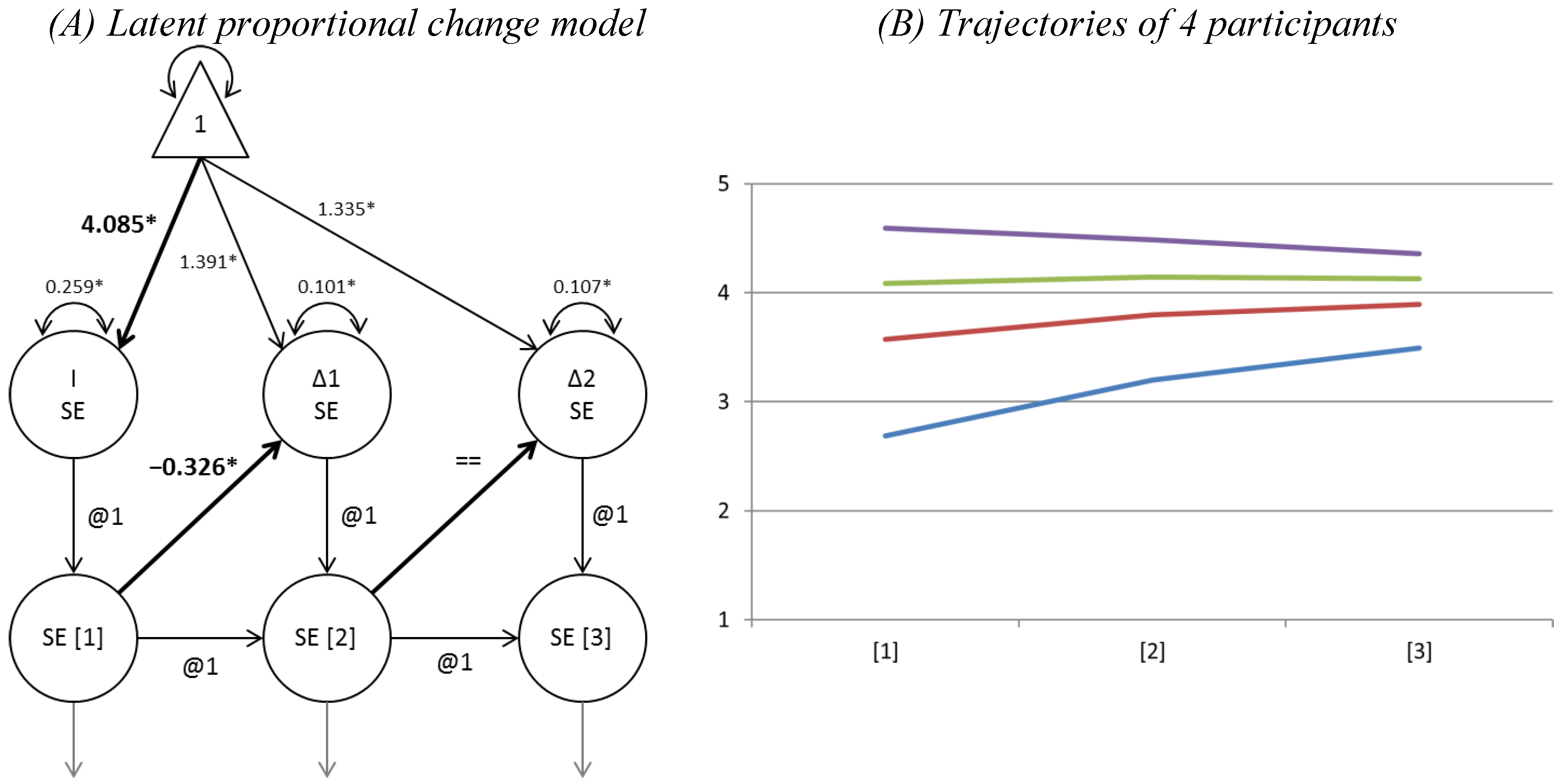 - an LDS model without autoregressions and with a latent slope (constant change model) against an LDS model with freed autoregressions and without a latent slope (proportional change model).