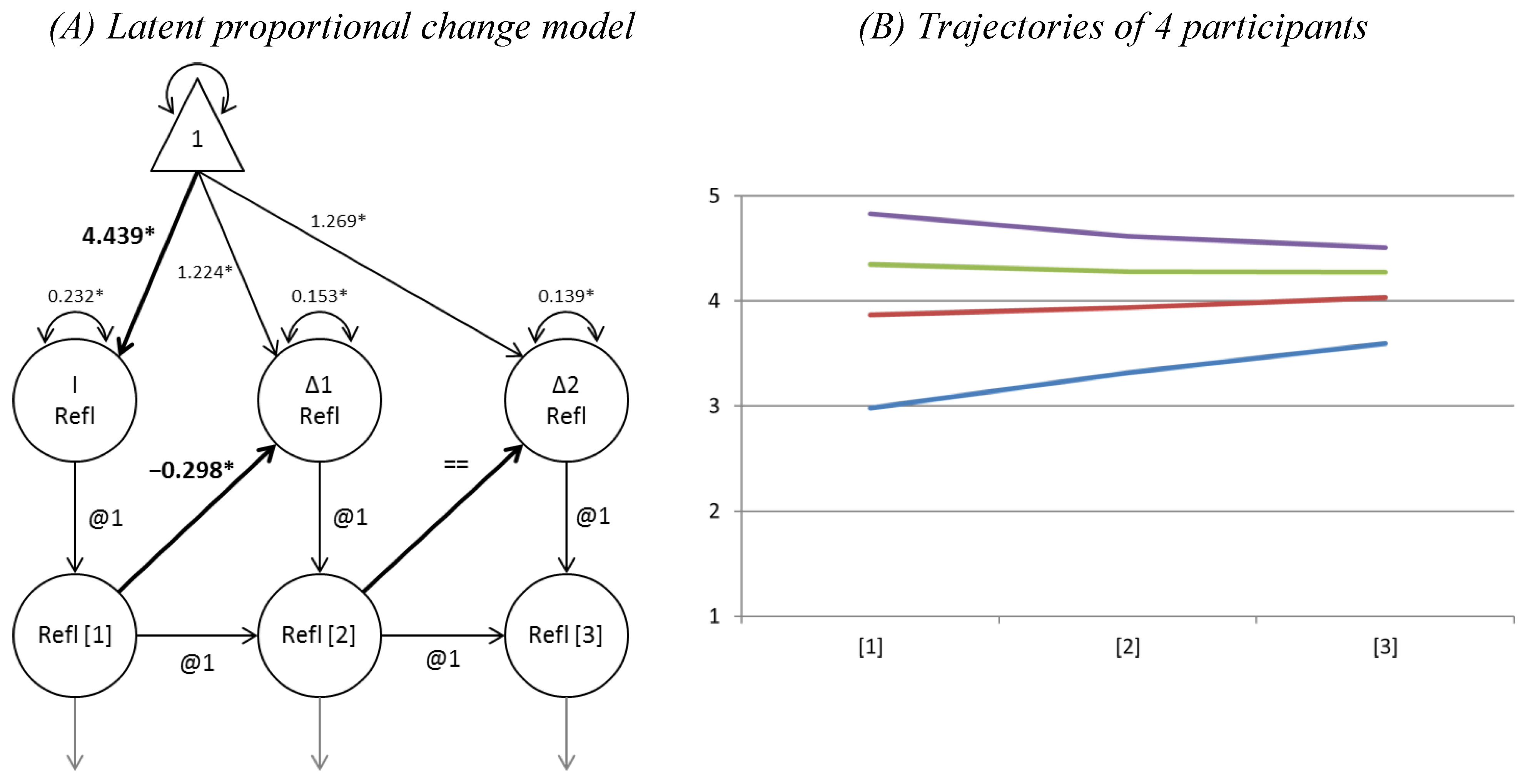 In the second step we extended the best fitting univariate change score model to multivariate LDS models. As multiple variables are included, the initial factors and slope factors of different variables will also be correlated. More interesting however are the coupling parameters (γ’s, see Appendix 6) between difference factors at time t and measurement occasion factors at time t-1. These coupling parameters may be in one direction, but the coupling may also be bidirectional, such that reciprocity between variables becomes a testable property of the model. The couplings relate variables on all occasions, that is, they are now dynamically related. This means that a variable’s change depends on the variable’s level at a previous time point and on a systematic growth rate, as well as, when coupled with another variable, on the level of the other variable at a previous time point. Change patterns therefore depend on the presence of these parameters, and even when parameter values are constant over time non-linear trajectories may be obtained (see for an example [93]). The parameters are interpreted together, because they jointly bring about the dynamics of the system [27]. For testing our hypotheses, the coupling parameters are studied because they test for the prediction (over time) of one variable (e.g., self-efficacy) on another (e.g., self-reflection), and therefore strengthen claims of causality, and provide a strong basis for claims of mediation [18,20]. Moreover, these predictions are independent of outcome variables’ histories.