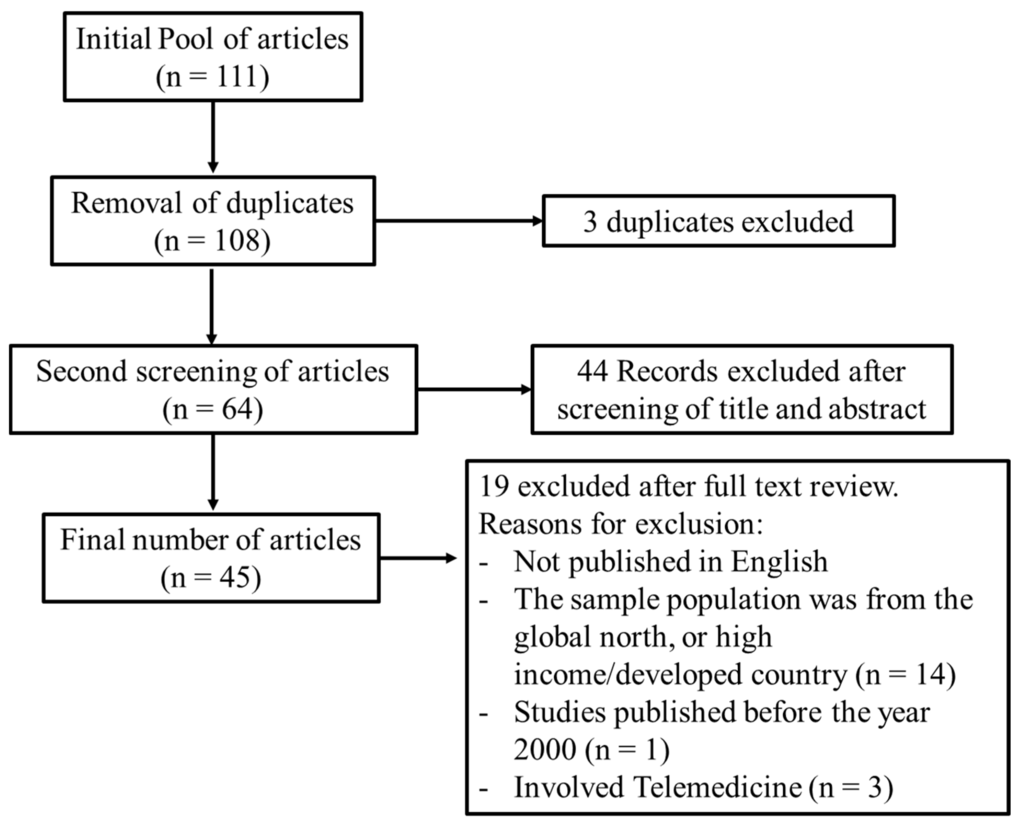 For the third step, we hand-searched relevant articles from the reference list of the 58 articles, which yielded another 55 articles, yielding a total of 111 articles. We compiled the 111 articles into a reference organizer (Zotero) and imported the library into to a reference manager (Covidence). We removed three duplicate articles, and two authors then independently read all 108 article abstracts to further screen for the inclusion criteria. We selected of 45 articles for full-text review [,,,,,,,,,,,,,,,,,,,,,,,,,,,,,,,,,,,,,,,,,,,,] (see Figure 1).