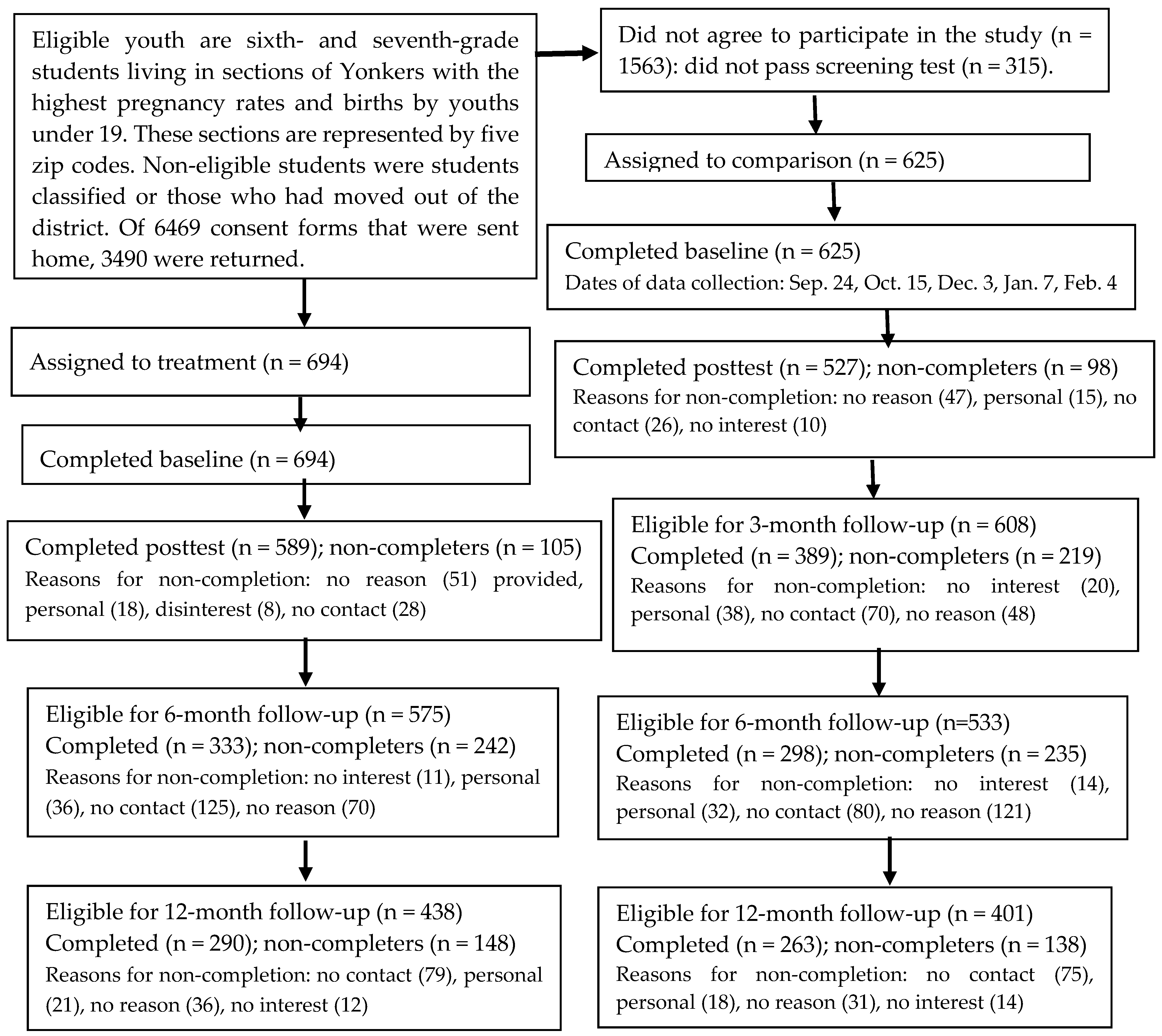 Both active and passive strategies were used to recruit eligible youth [25,26]. Eligibility was based on areas of the city with the highest incidence of teenage pregnancy. Schools were the primary venues for actively recruiting youths. Presentations were made at back-to-school nights for parents, as well as at assembly programs for eligible sixth- and seventh-graders. Recruitment packets with informed consent forms were sent home with students. In order to incentivize the return of the forms, pizza parties were held for the classes with the highest return rates. Passive recruitment strategies included spots on local television public programming and flyers in the community. Over the 5 years of the program, 6469 packets were sent home. About half (54%) of these were returned (see Figure 1), 314 did not pass screening (students either did not speak English or had a special education classification), and 45% of parents declined to have their child participate. Of the 1612 youths with parental consent who passed screening, 82% were randomized to one of the intervention arms; 18% did not attend the program. The consort diagram presents the number of randomized youth eligible for inclusion in the follow-up data collection at the time of this study. It is instructive to note that follow-up data collection was based on the anniversary of post completion of the intervention. Thus, in the current article, only 1108 youth were eligible to be included in the six- month analytic sample.