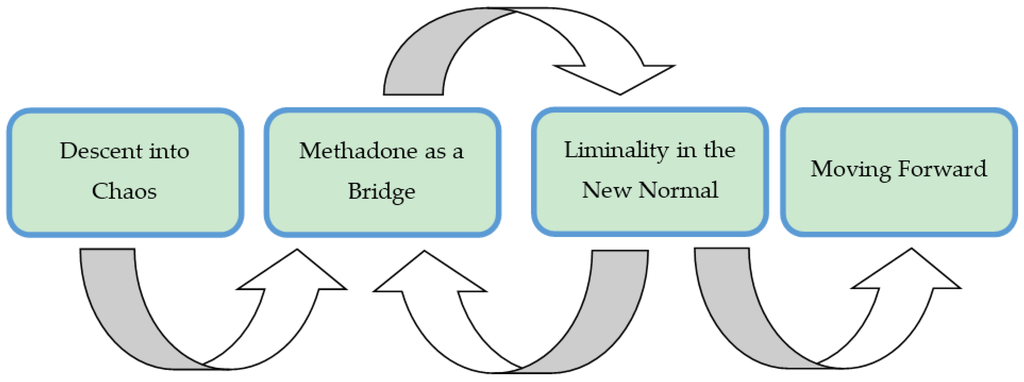 Results are presented according to four themes that highlight key aspects of the participants’ experiences. First, participants revealed a “descent into chaos” as their addictions began to worsen over time. Second, participants’ described their experiences of “MMT as a bridge” to recovery from addiction. Third, their “new normal” daily life was characterized by liminality and shown to be linked to people’s experiences of MMT. Finally, participants’ discussed having hopes for “moving forward”. The interrelationship between these themes is depicted in Figure 1, which serves to visually represent the main topics that emerged as people shared their experiences. Pseudonyms are used when referring to participants.