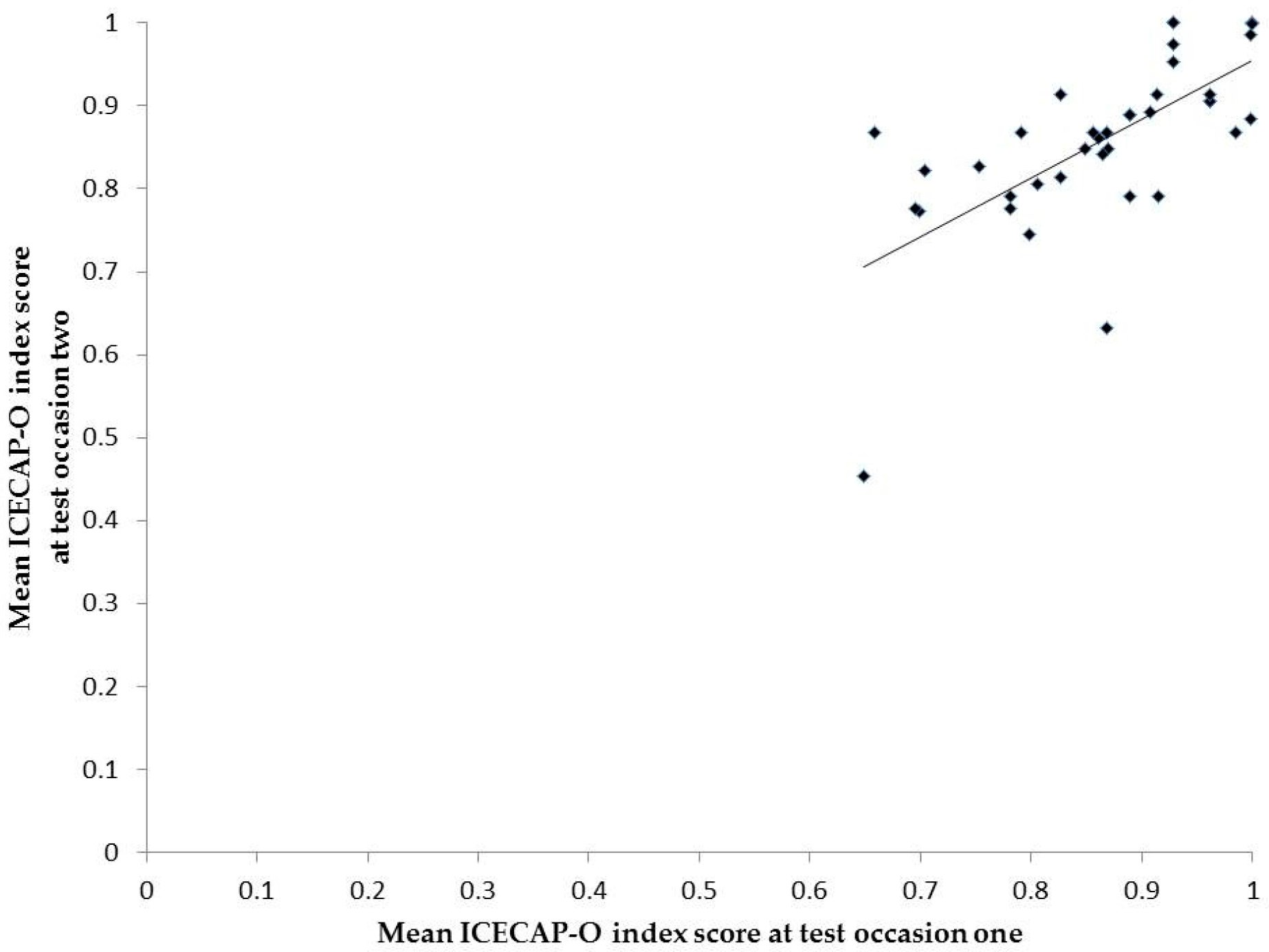 Correlation between ICECAP-O index scores at test occasion one (x-axis) and test occasion two (y-axis). Possible range from 1.00 (full capability), to 0.00 (no capability).