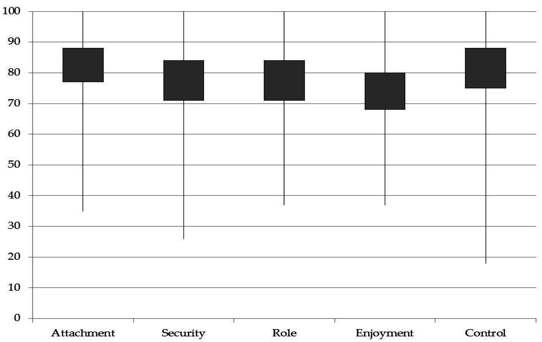 Participants’ rating of item relevance showed that attachment was valued highest, followed by control, role, security, and enjoyment. This order is similar to that observed in the original UK study on older persons [4].