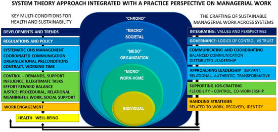 The theoretical underpinnings that we suggest for leadership interventions that support managers’ knowledge of health-promoting conditions, as well as their capability to craft sustainable work, are derived from system theory approaches [20,21,22,23] in combination with theories of managerial and institutional work practices [24,25,26]. The system theory places the individual in the center, as the learning, understanding, and crafting of sustainable working conditions with respect to different system levels, contexts, and domains (work/home) starts with individuals’ own reflections about their experiences and values. Likewise, recent theoretical developments in managerial and institutional work argue for bringing managers’ sense-making, translation processes, bridging across levels, and handling strategies, back into studies of organizing and institutional theories [33]. In this context, this perspective can offer a more holistic understanding of the multi-components required for health and sustainability, when such components are sorted into system levels, and integrated with practice perspectives of managerial work and organizing practices, for crafting and bridging sustainability across systems and levels (Figure 1).