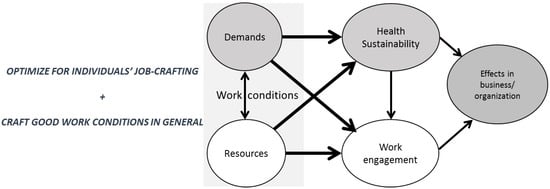 The individual perspective in this context means the support of individual crafting of resources and demands [54,75]. This could mean supporting the development of individual handling strategies for work and recovery, supporting their adaptation of demands, and optimizing individual resources to fit the individual’s capability and ambition.