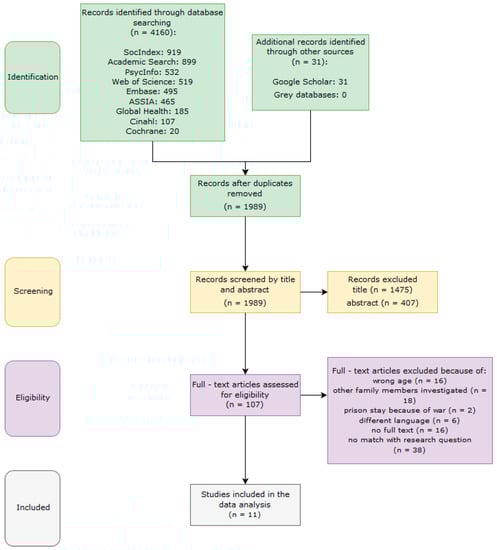 As shown in Figure 1, of the 4160 studies that were identified from the different databases, 2171 citations were removed due to duplication. In total, 1989 studies were screened for inclusion. A total of 1475 studies were removed because of their titles, 407 were removed due to their abstracts. After reading the full text from 107 studies, 80 were not relevant for the research questions and 16 were not available as full text. In total, 11 of the 107 studies met the inclusion criteria and were included in the review. From the 11 articles, five were eligible for the first part of the research question—coping—and six studies were found to be eligible for the second part of the research question—interventions. The further data extraction and illustration of the results, as well as the discussion part is divided into the two parts of the research question—coping and interventions.