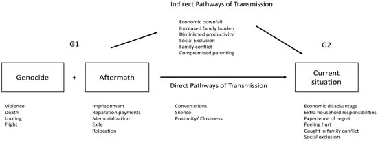 Our findings confirm the profound effects of the genocide and its aftermath on individuals, families and communities in Rwanda [,,,,]. Mothers testified to experiencing and witnessing many traumatizing events, and to bearing the psychological, physical, social and economic consequences of the past violence. They articulated clearly and strongly how the past continued to shape their present lives. Their children learned and lived effects of the genocide and its aftermath as well, and in varying degrees expressed connections between their daily preoccupations to what had happened in the dark hours of the past. In this section we describe the different mechanisms in the intergenerational transmission of legacies of genocide and its aftermath that we identified in our findings (see Figure 1). We first describe various ‘indirect pathways of transmission.’ Indirect pathways of intergenerational transmission concern the ways in which the genocide and related events affect the second generation’s socio-ecological environment, and through that, the child. These pertain, firstly, to the economic dimensions of family life, which affect the daily experiences of children of the second generation and include economic downfall, an increased family burden and diminished productivity in our respondents’ perspectives. Other mechanisms relate to interpersonal dimensions and include social exclusion, family conflict and compromised parenting. Subsequently, we describe the ‘direct pathways of transmission’ we identified, namely closeness between parent and child, and intergenerational conversations and silence (cf. [,]). The direct pathways of intergenerational transmission concern the ways in which the genocide and its aftermath are reflected upon, reconstructed and communicated or silenced by the mother to the child. In the last part, we take a child-centered perspective and describe how the interviewed children experienced and dealt with the legacies of genocide and its aftermath transmitted in the family environment.