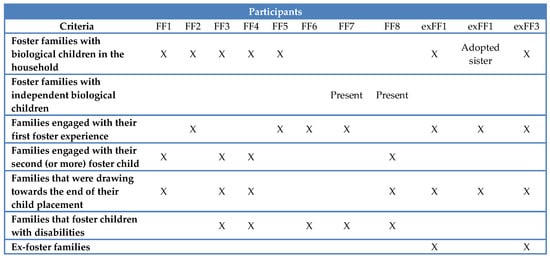 The theoretical sampling [,] covered a total of 11 families governed by two different supervision organisations (one public, and the other a NGO). We did not intend to select a statistically representative body of subjects, but nevertheless obtained a the diverse array of domestic situations found within the scope of the foster care system. This study adhered to the analytic criterion of “maximum variation—including few cases, but ensuring the cases are as different as possible to evidence the breadth of variation and differentiation on the ground” [] (p. 71), complemented by the criterion of convenience, according to the limited availability of resources, both economic and temporal. The participating families all had biological or adoptive children. In-depth interviews took place, lasting for an average of 1.5 h or more. Half of the interviews were family interviews. The selection criteria for the foster families chosen to participate in this study included, as can be seen in Figure 1: (i) Foster families with biological children in the household; (ii) Foster families with independent biological children; (iii) Families engaged with their first foster experience; (iv) Families engaged with their second (or more) foster child; (v) Families that were drawing towards the end of their child placement; (vi) Families that foster children with disabilities; (vii) Ex-foster families. In terms of our access to the field, collaborating professional teams of accompaniment provided the physical space for the interviews. The remaining interviews were conducted at the carers’ homes or at other locations.