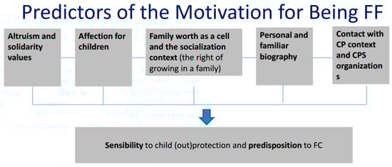 It can be concluded, as can be seen in Figure 2 (Predictors of the Motivation for Being a Foster Family), that the motivation of these foster families was rooted in values of altruism, supported by their affection for children and their sensitivity to issues of child-protection. These factors, associated with a carer’s personal and professional biography, as well as their direct or indirect contact with care-contexts in which children lack protection, produce a predisposition to become a foster family.