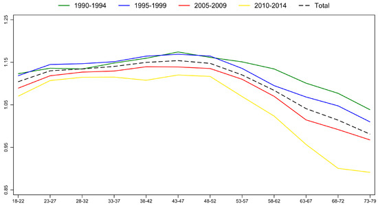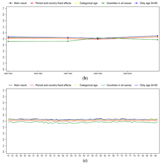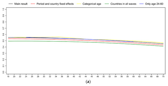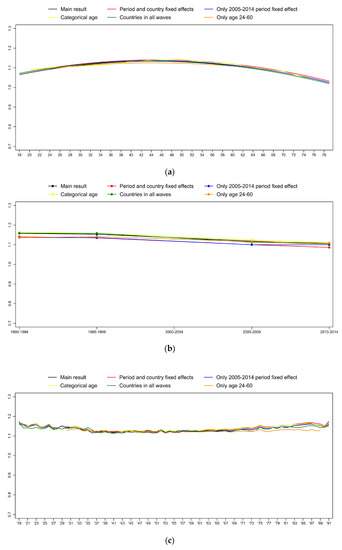 First, we specify the effect of time period and country as fixed instead of random (red line on Figure 5). Then, we use a categorical age variable instead of the quadratic specification. This model includes age group dummies with 5-year brackets (yellow line on Figure 5). We also restrict the sample to fourteen countries that participated in all the four waves of the WVS/EVS (green line on Figure 5). Lastly, we restrict our sample to respondents in their active ages (ages 24–60) (blue line on Figure 5). None of these alter the conclusion of the main model. Only the period effect in the model with the countries participating in all waves differs slightly from the other results. This is not very surprising, since thirteen of these countries are Western European, and previous results suggest that period differences are not the same in post-socialist and in the EU-15 countries [1].